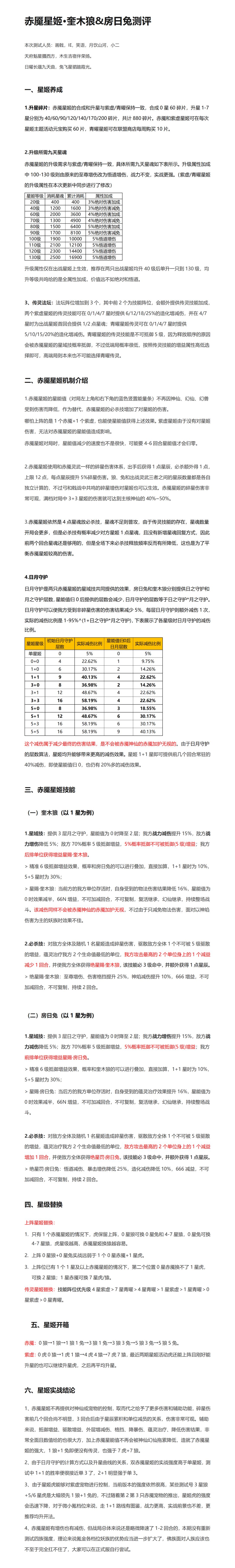 本次测试人员:笑语、画戟、诠释了梦、燕公子、月饮山河 一、星级替换 1.上阵:0星獬可以换1星马,0星龙不能换1星狐 1星獬可换7星马 1星龙保底换6星狐,勉强换7星狐 马现在亏模,它加的10~20%伤害修正用不上,789回合加的日月贯穿也难吃到,现在马强度不如狐。 注:獬与马是属日,龙与狐是属月,星姬上阵时注意日月结合,不要同时上阵两个日或两个月! 2.传灵:1~2星兔/狼<1~3星