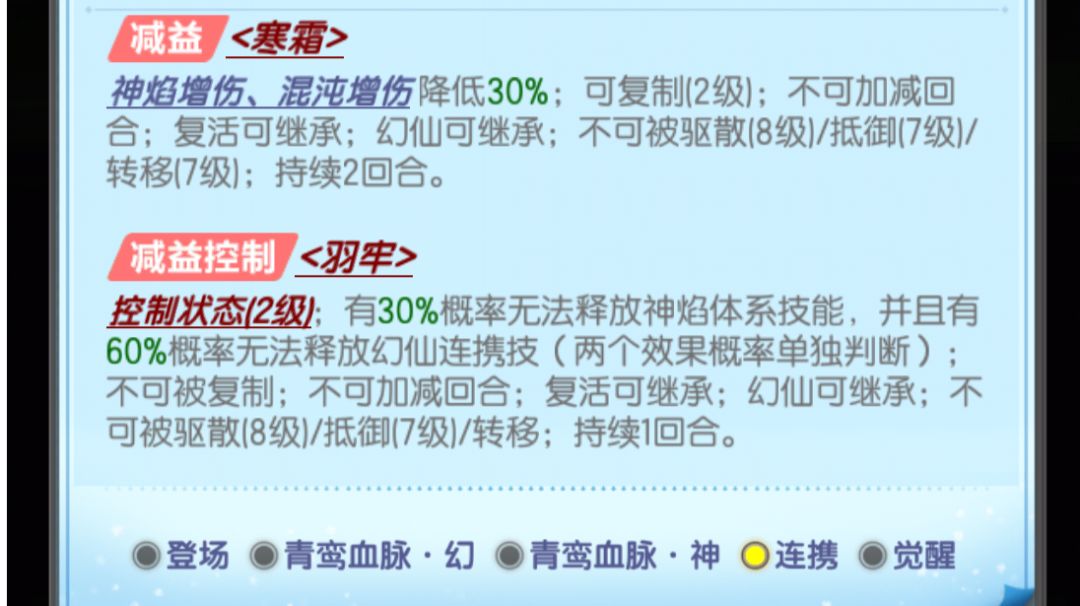 一,定位 全程持续双控制+高连击核心幻仙。 #道友请留步 二,特点 1,双控。连携技能是核心技能,控神焰体系技能+控幻仙连携技能。这个控制有几个特点 一,全程参与控制,不限制回合,活着就行 二,每回合触发。只要能出手就行 三,控制强度高。控神焰体系属于硬控,普攻都无法触发,控连携属于首次出现。也是首个双控制的减益。另外就是连携技能是246幻仙独有,需要出手才能触发,因此控连携其实就是控的核心幻仙
