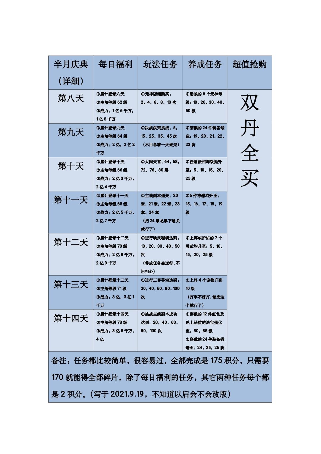 很多新手刚出村元宝都不敢花 担心会断档 其实每期龙都打满 只买青曜道具是不会断的 元宝剩比较多的情况下 幻彩也可以适量的买些 还有我把紫书也都加进去了 紫书个人是建议前期要买的 紫金复活书强度非常高 主核必备 前期等级不够,封神还嫖不到紫金天书 当靠白嫖的话,出第一本复活书还是太慢了 已经出复活书了后面紫书就可以不买 不买的话可以自行扣掉 15片紫书11250元宝 ----------------