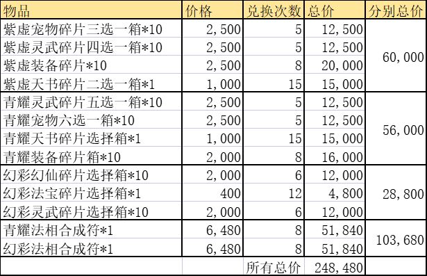 统计花销元宝数 推荐购买:紫虚所有物品、青耀天书(花销7.5w) (新区可以加上青耀宠物。灵武提升不大,酌情购买)