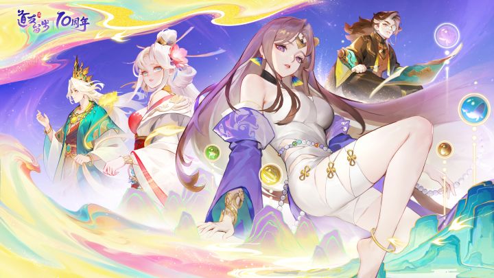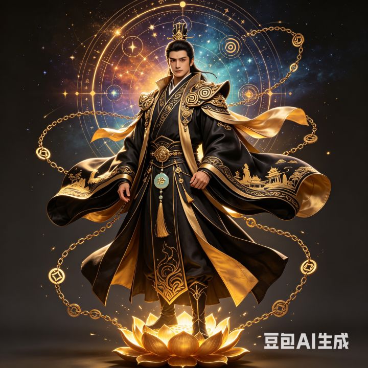 第一套:【天衍道尊】男装设计理念:这套男装以"天道轮回,十载证道"为核心主题。整体采用玄黑与鎏金的配色方案,黑色象征大道无极的深邃,金色代表十年辉煌的成就。• 形制设计:宽袖道袍搭配云肩披风,肩甲处融入八卦符文刺绣,腰间系有十周年限定玉佩(刻有"拾"字篆体)• 细节元素:衣袖边缘以金线绣制十年历程中的经典副本场景剪影;背部披风绘有星宿流转图,暗合"道友"宇宙观• 特效构想:行走时脚下生金