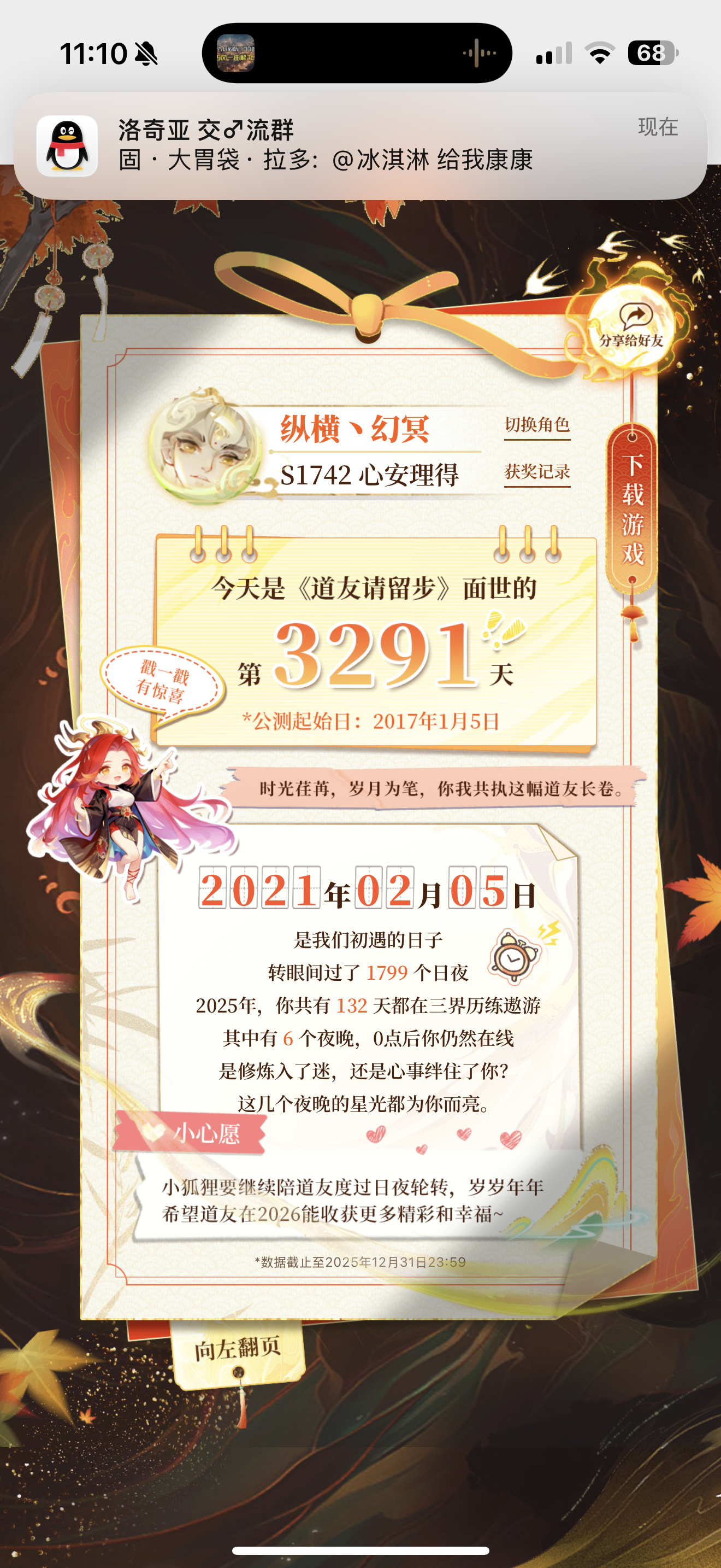 三界很大,大到足以承载万千道友的凌云志。三界也很小,小到恰好装得下你我并肩走过的晨昏。2025年度《道友日记》正式开启!愿这本为你而写的记忆之书,能让你看见。接下来和小狐狸一起翻开这本以时光为纸、回忆为墨的《道友日记》吧!▼ 你的故事,值得我们一同珍藏 ▼初次相遇与你相伴成长见证暖心礼物感谢你与《道友请留步》携手相伴走过2025年。小狐狸悄悄在日记里藏了一份心意,愿它能点亮你回