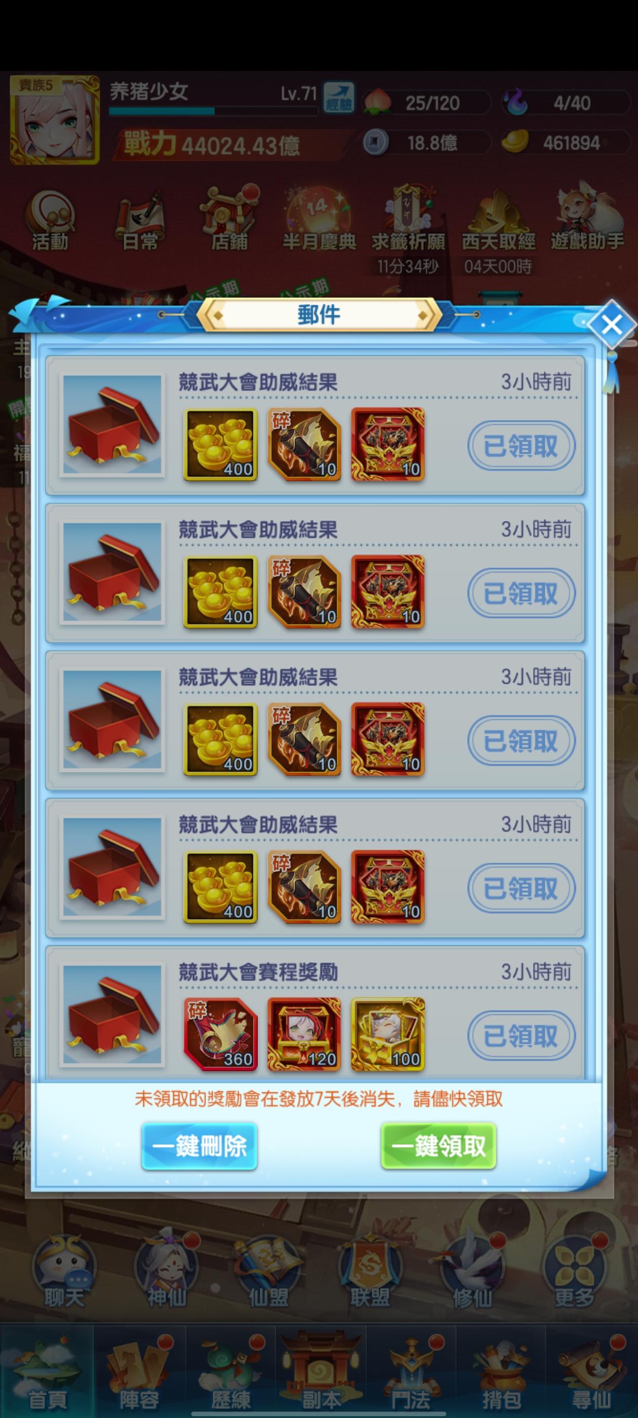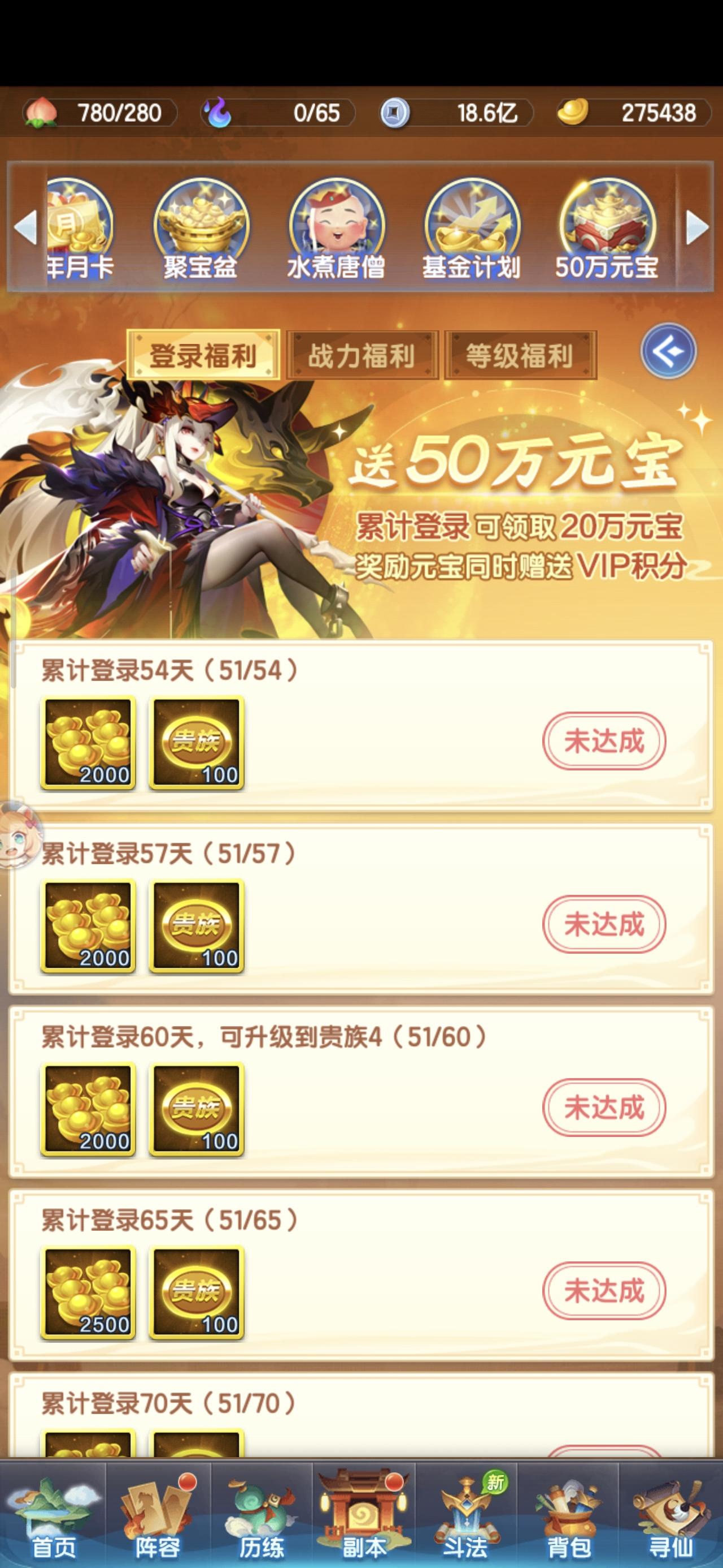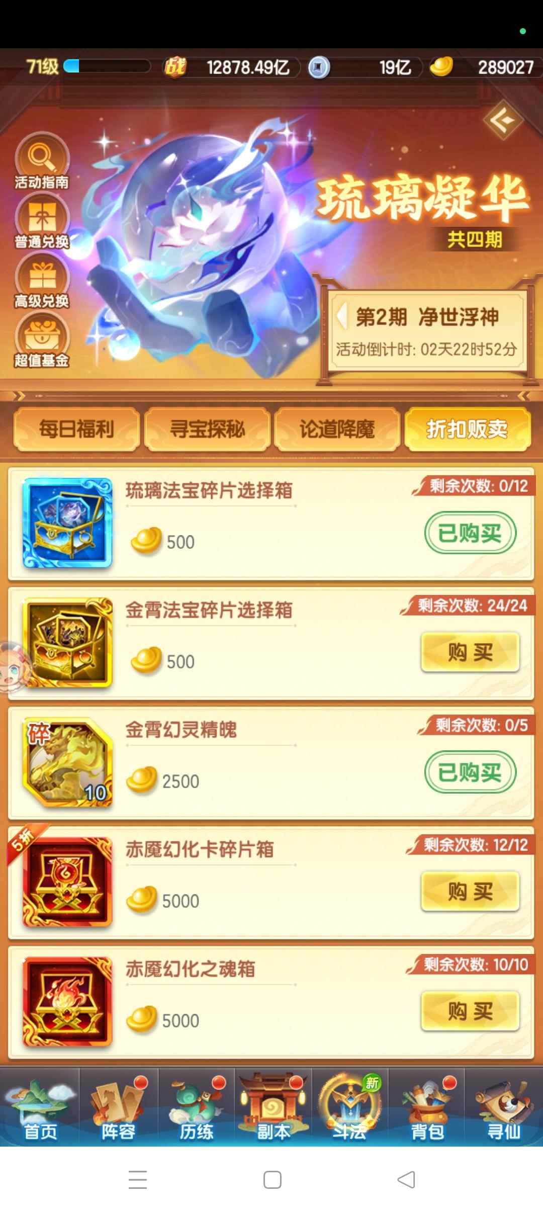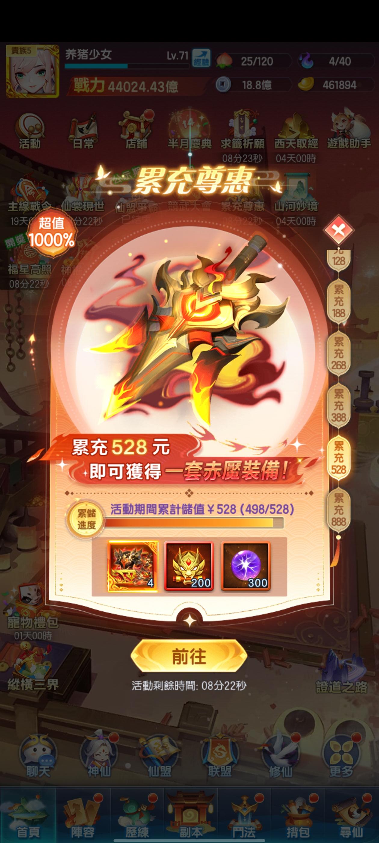 等级:71战力:4.4w亿元宝:46w氪度:498马上出村了,攒的元宝少了点,寻仙丹会仙缘三个活动都花了元宝抽奖励。 月卡纠结了一下感觉不长征法相没必要氪,还是没氪。我的赤法总是打不过别人抽到金霄神仙的紫法,只能等新神仙了。 竞武大会运气有点差了,明明是战力第9,第一次竞武大会32强,第二次16强。助威4次全错。