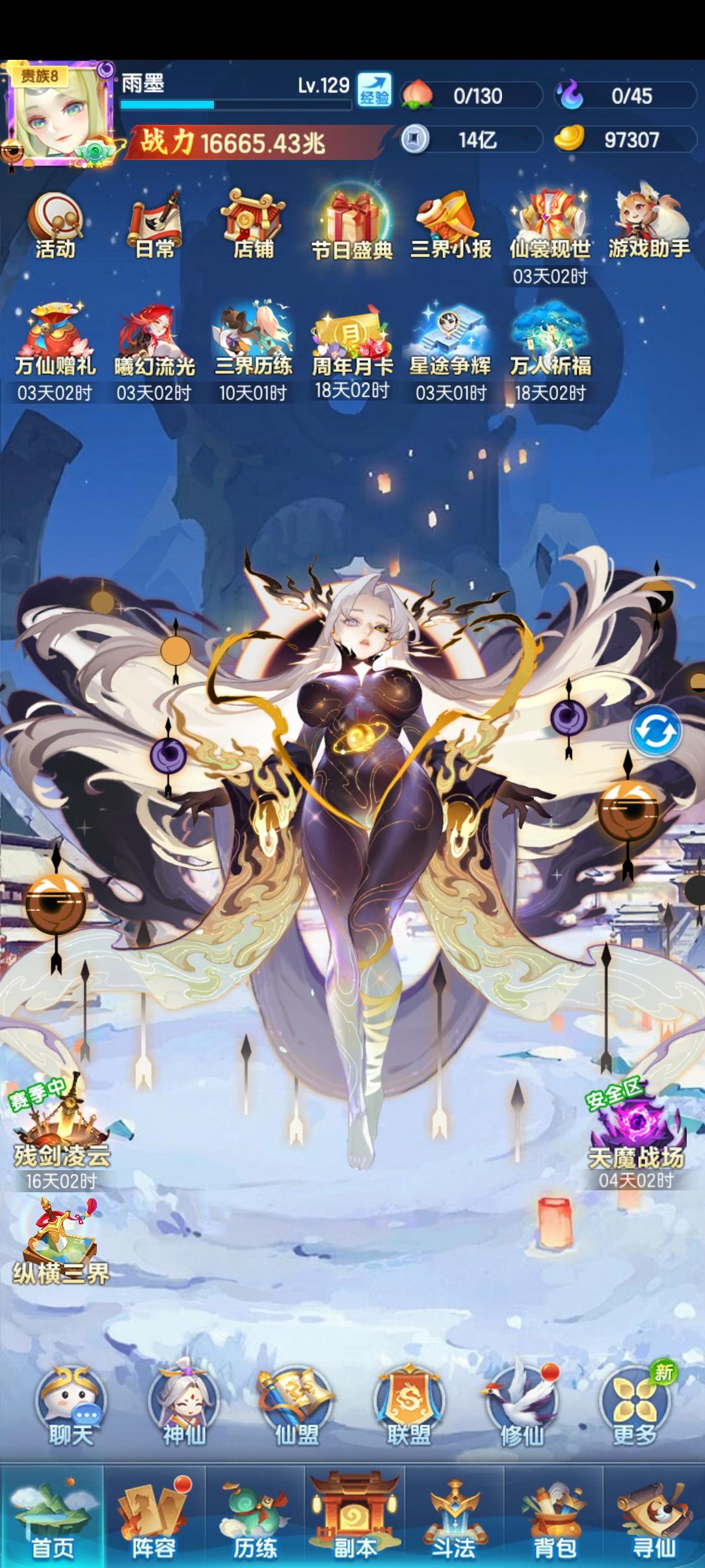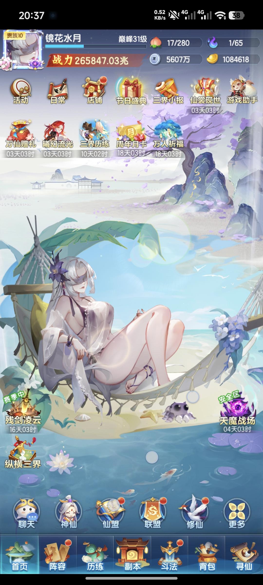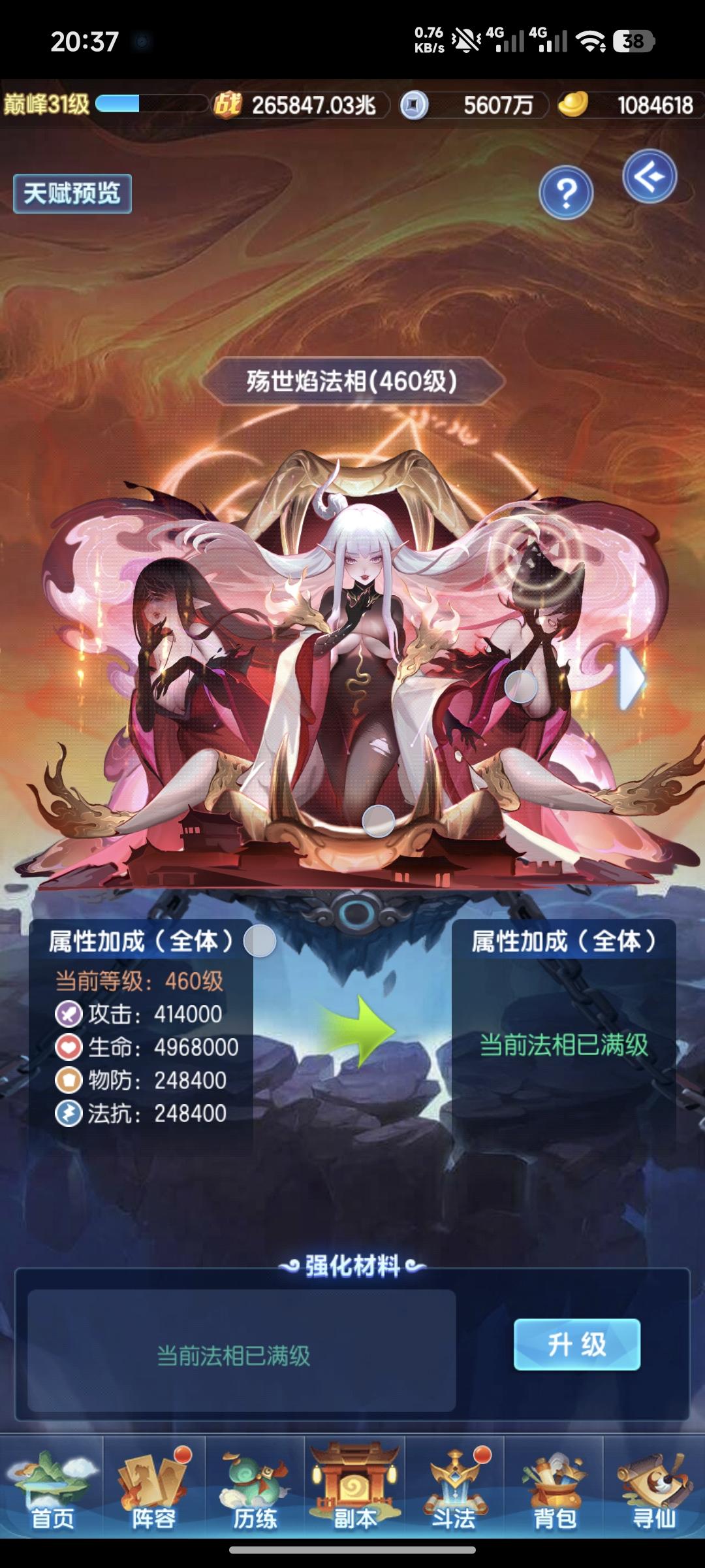 元宝:108w战力:26.5w兆等级:巅峰31级日常提升,法相等级毕业