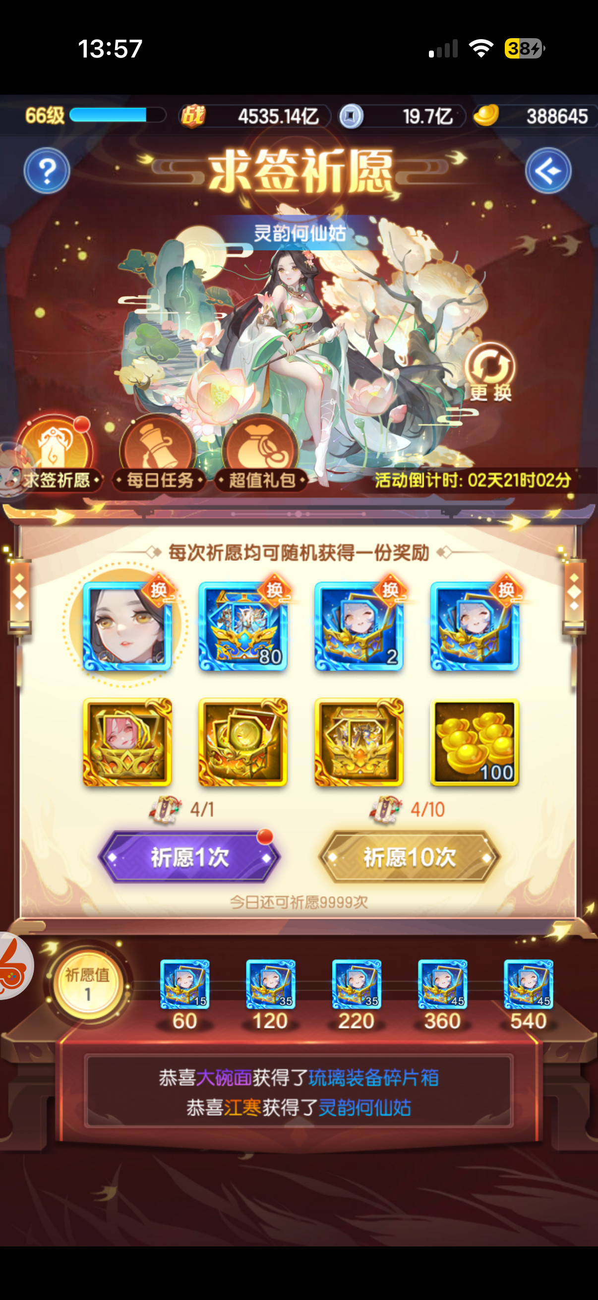 等级:71战力:4.4w亿元宝:46w氪度:498马上出村了,攒的元宝少了点,寻仙丹会仙缘三个活动都花了元宝抽奖励。 月卡纠结了一下感觉不长征法相没必要氪,还是没氪。我的赤法总是打不过别人抽到金霄神仙的紫法,只能等新神仙了。 竞武大会运气有点差了,明明是战力第9,第一次竞武大会32强,第二次16强。助威4次全错。