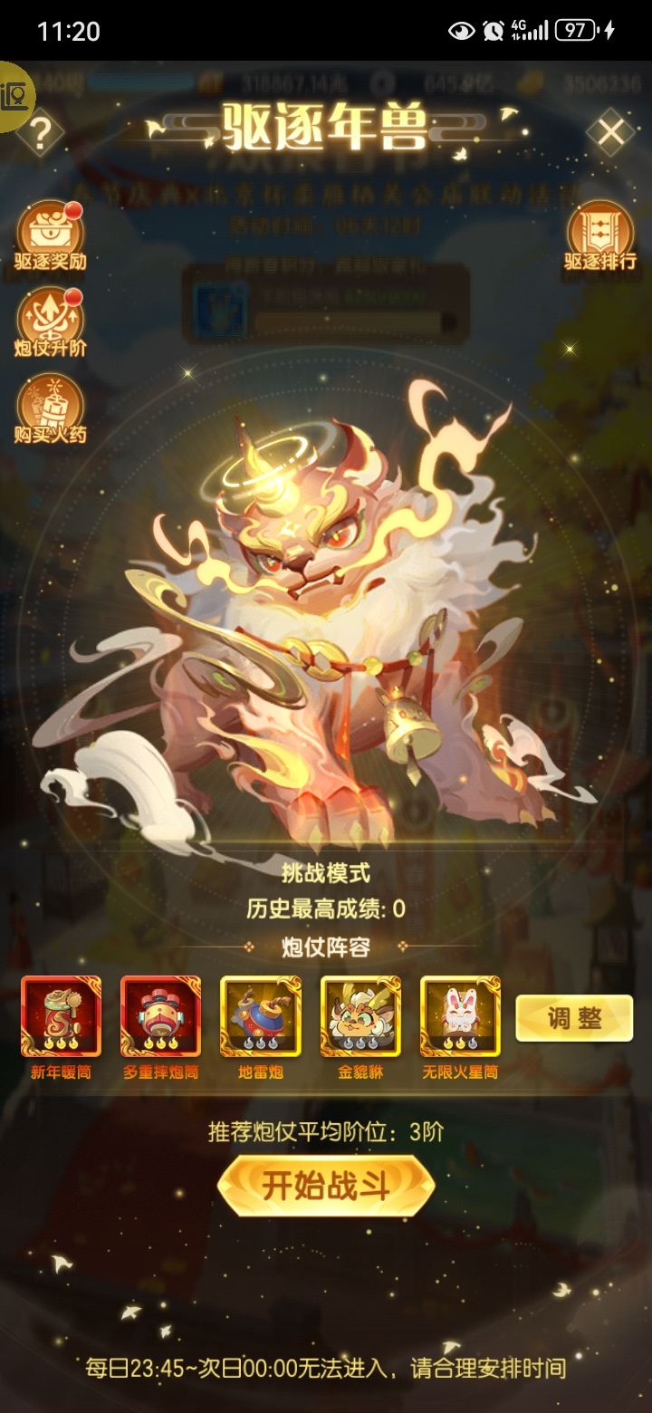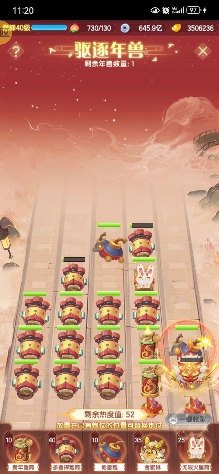 正常排兵布阵,白嫖党是根本玩不了的!采用植物大战僵尸放弃流抢发育玩法即可!开局放弃最左边三路不用管,年兽再多通通交给最底下的爆破烟花。最右边一路,先在最底下放一个暖桶,继续放第二个,第三个。中途出现年兽后,第一时间在倒数第四格子放一个二星兔子,基本就不用管了,前期一个兔子能清的过来。然后旁边第二路一样操作,中途注意左边三路,如果底下的烟花全都触发了。就要开始放多重三线桶了,这时候能量应该很多了!