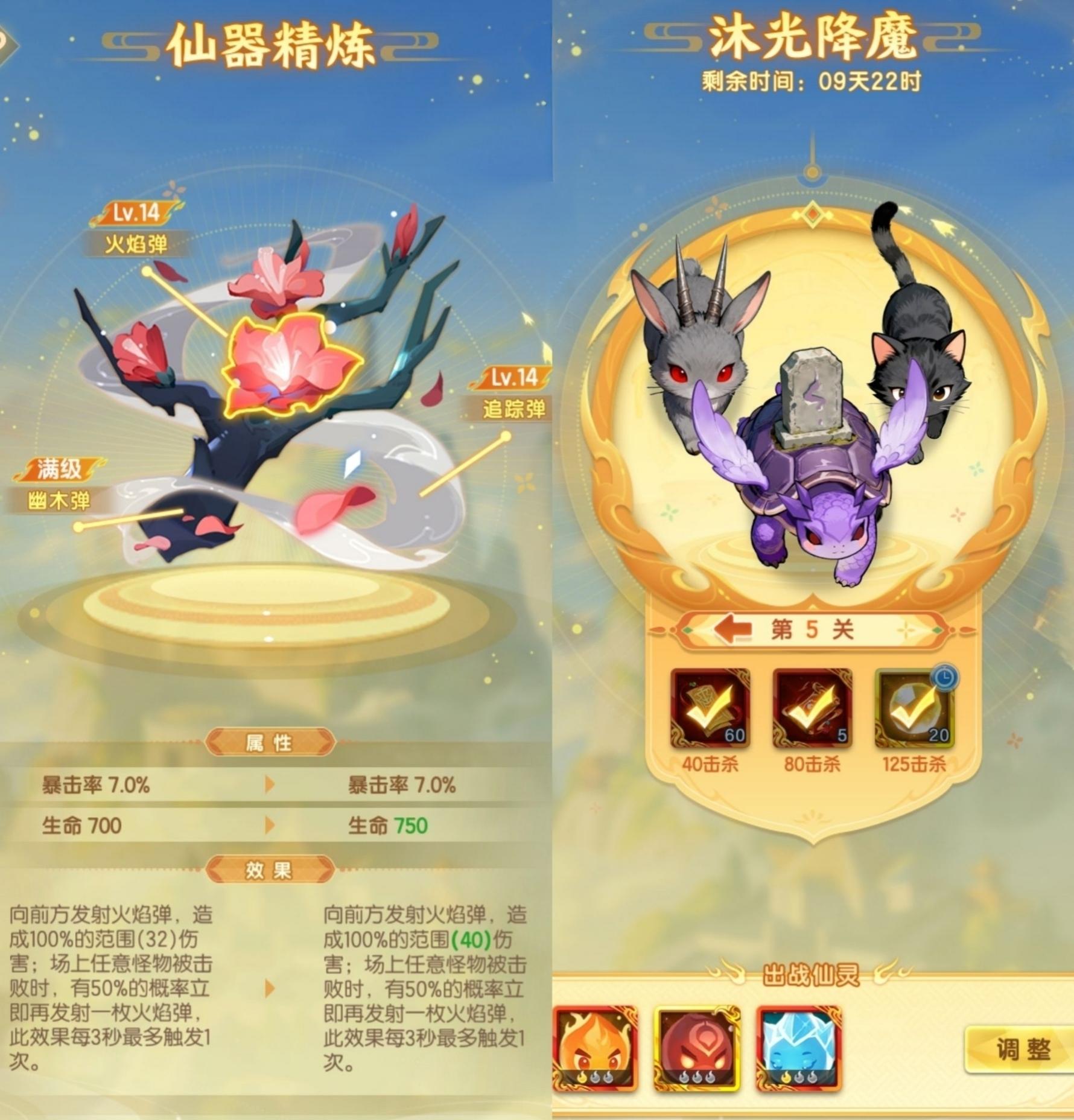 1.仙器精炼:幽木弹满级、火焰弹/追踪弹14级2.仙灵进阶: 一阶加功仙灵、一阶冰冻仙灵、零阶化身仙灵3.开始战斗:注意冰冻时机要来回拉扯,最大限度减速敌方单位和宝箱,不要盯着一个打PS:第5关首回合需凹出幽木弹和火焰弹,即可稳过第5关。#道友请留步周年庆