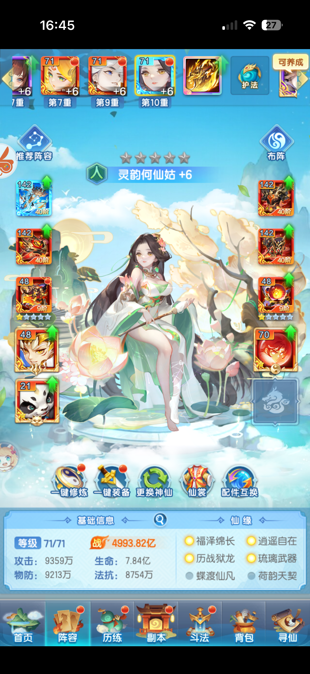 今天开了新的请仙活动什么?你怎么知道我出了完整女帝?嘿嘿开个玩笑我也没想到能出完整神仙这一下子主c就得换了白帝我对不起你但是我依然会把你放在副c的位置上的今日战力提升很大因为65有一个大进阶实战上提升也不小因为开放了灵武大佬们帮我看看灵武这样放可以不需要咋调整感谢各位大佬啦(最后说一句,金霄灵武炎霜剑真的好漂亮这