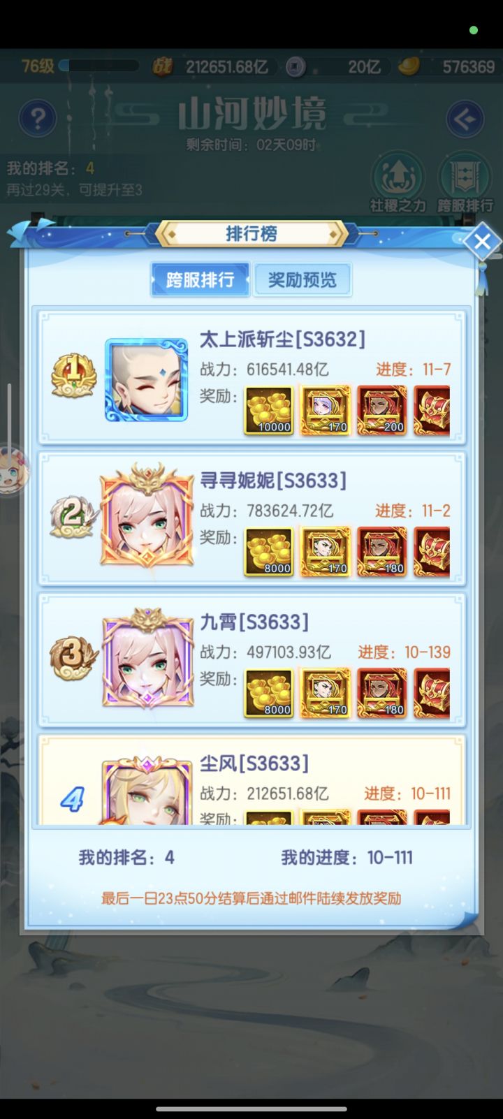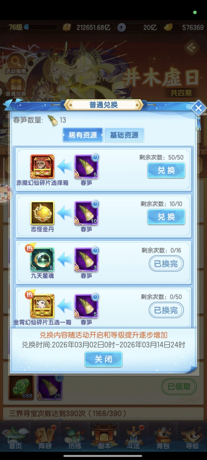 爽!今天书阁也是狠狠消费了一大波,战力从38万亿提升到了54万亿,灰常舒爽!现在背包好多道具都是半份 开不出来或者等级不够比如星姬,等80级就又能提升一大截了,小小期待一手~今天还打了晶脉也是成功稳站200的位置拿到了特级宝箱,希望等后面区的道友加进来之后还能稳站。目前本区战力排11,战区竞技排去53了,明天最后一个区出村应该就开战区战力排行榜了吧?元宝剩43万也不知道后面切幻化够不够,不过还