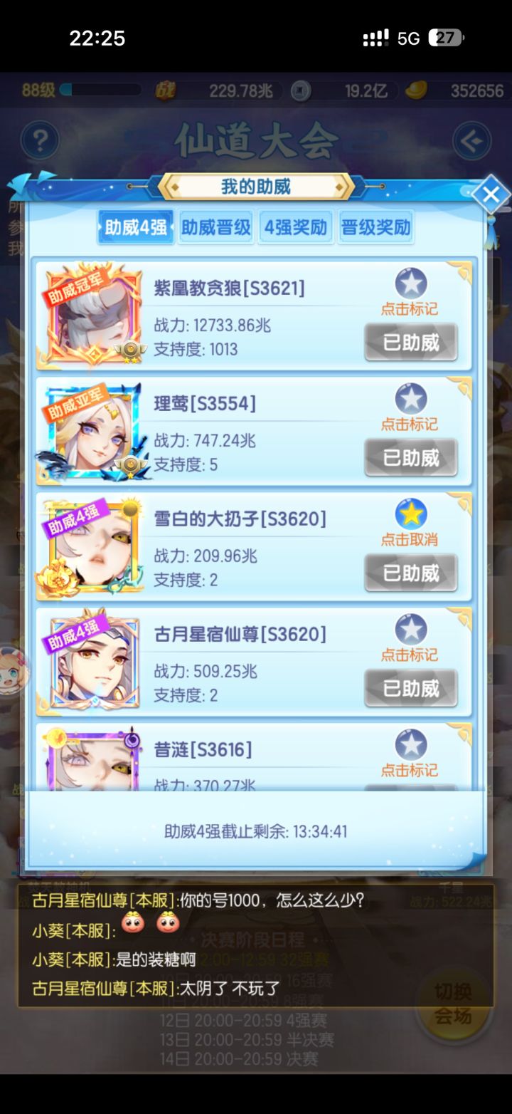 今天提升较少,太多课了有些东西没有点这次的仙道确实好难猜,四强也是随便选了俩个,一个是本人,还有一个是古月大佬。晋级助威今天还忘记选了,助威奖励估计拿不到太好的了这周开始还有晚自习要上,好烦,为什么大学生还有晚自习