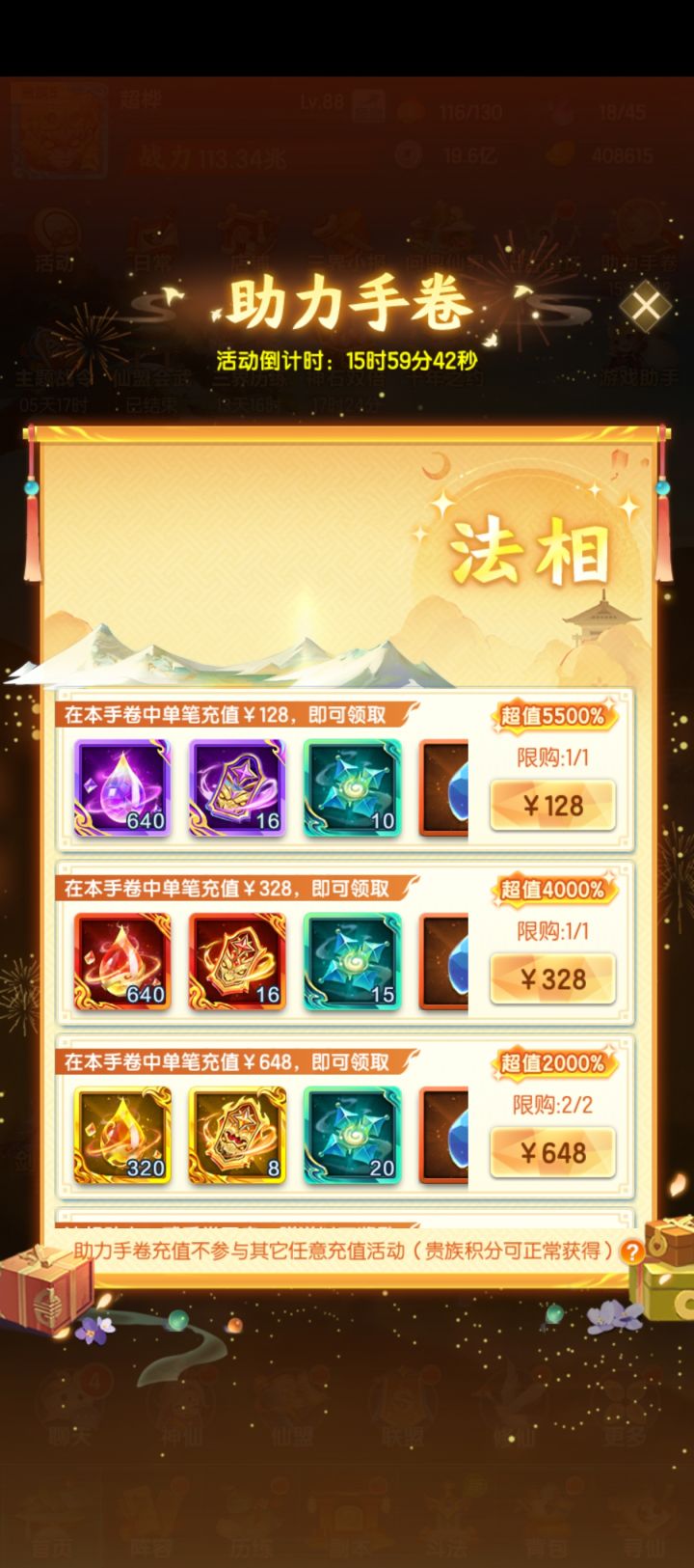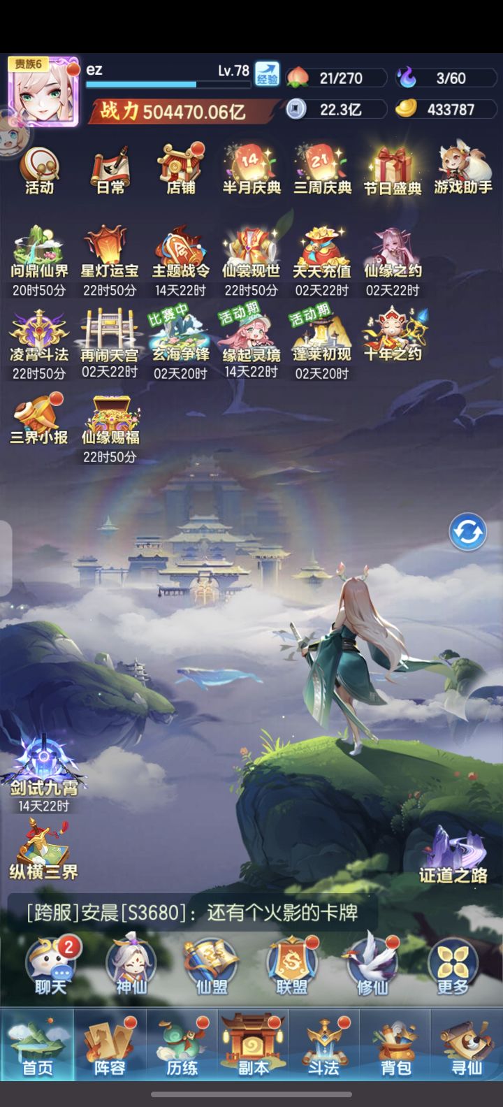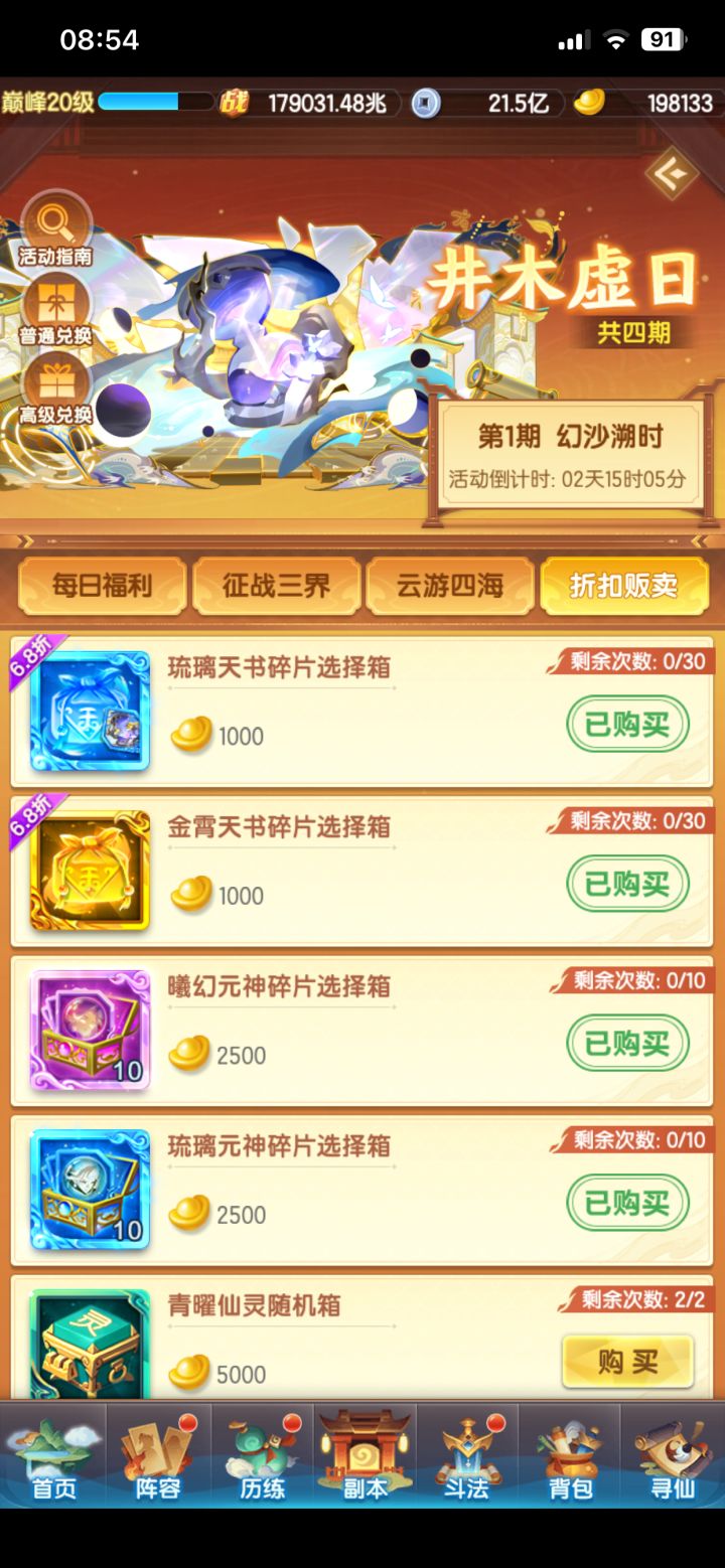 爽!今天成功拿到1星曦幻神仙,战力从565兆提升到了635兆,等级也来到了94级,等95级又能神仙进阶提升一波战力咯,元宝还剩39万。元宝有点不够用了,这期的女娲石还没买,感觉有点买不起了,准备跟太虚神晶一样等后面元宝宽裕了再慢慢买吧。目前战力排在本区46,竞技场打到了33名。下一期切幻化元宝估计会大残,只能走一步看一步咯,希望能稳住直达五星吧。OK那今天就这样,明天再见~