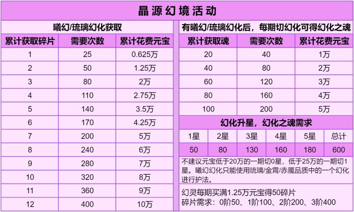 本次测试人员:笑语、玄羽天翔、醉梦、IE、君鸯、叶轩一、幻化获取1.幻化活动每半个月一次,并且接下来一年都不会出新,元宝少的不用着急慢慢来。如果元宝少且不急着一时提升,可以一次只买一半幻化,下次再升幻化1星,这样买比一次0星下次1星省1.5万元宝。2.琉璃幻灵还能用16个月,要一直买到3阶。金霄幻灵还能用4个月,幻化合成出来后还有二十多万元宝的,金霄幻灵可以买到0~1阶,十几万元