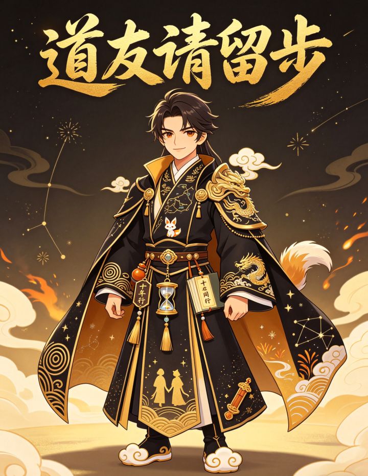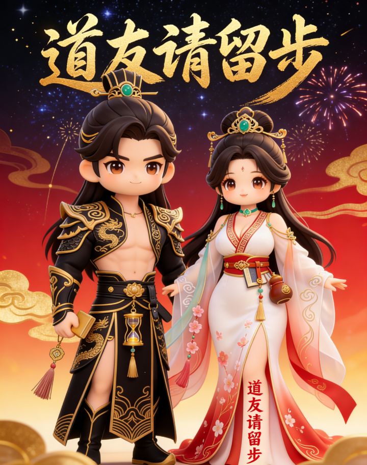#道友十周年变装共创 以十年陪伴为核心,设计思路如下: 一、以时间为核心具象化设计,衣摆袖口绣年轮纹路,腰间配金沙沙漏吊坠,披风裙摆织三界星轨;男主主色玄色+鎏金,女主主色月白+绯红,尽显时光质感。 二、融合人,道,妖,佛标识:道族添仙云肩甲、水纹披帛与凌霄/瑶池玉饰;妖族加狐尾暗纹、妖界流苏花样;人族缀烟火云纹,搭配酒葫芦/书卷配饰;佛族八部天龙肩饰,搭配莲花纹样。 三、道友羁绊·
