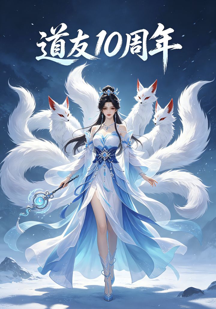 #道友十周年变装 以蓝白冰雪仙狐为核心,搭配灵狐与冰晶雪景,塑造清冷仙气形象,最爱的狐娘