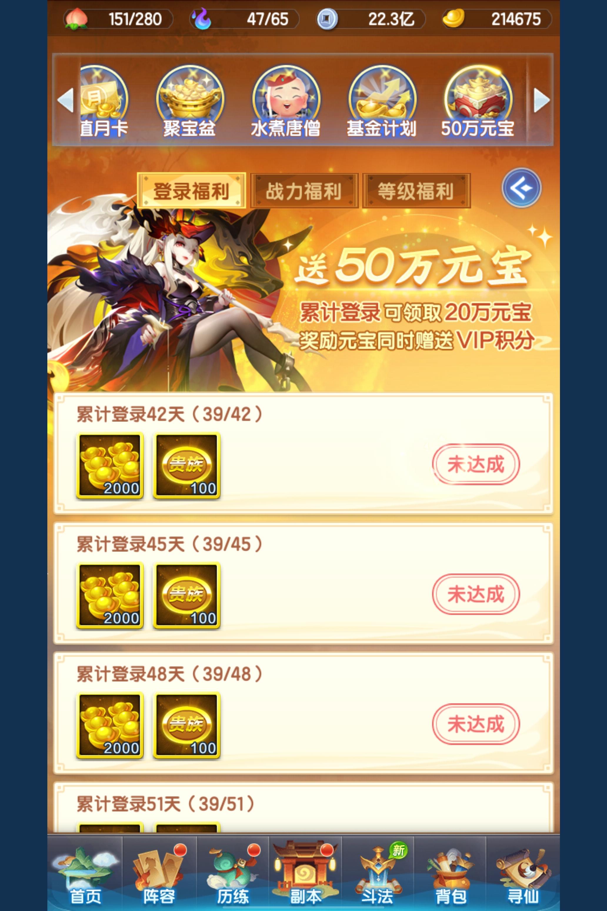 前面200兆好像忘记记录了,那记录下500兆吧.现在把赤图鉴开的差不多了,所以战力升得快,前天还只是400出头呢.元宝稳固减少,后面的主题活动得相应取舍了.这还是第一次这么干净的界面,前天活动什么的得有3排.那1000兆再见吧(这次一定不会忘)等级95,战力514兆(终于进前50了),元宝214675