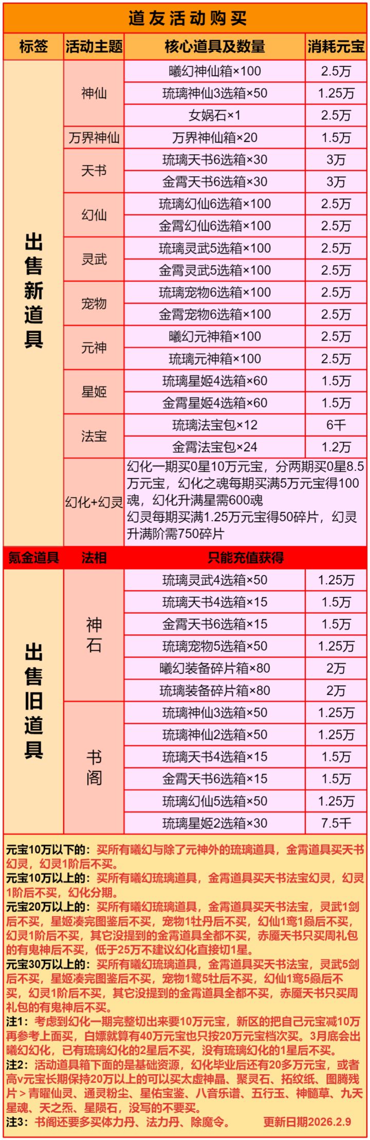商城:体力丹法力丹买满、除魔令10个,拥有或打算充紫虚以上品质法相的,还要买太虚神晶。110级后体力丹每天10个,130级后法力丹每天10个,在这之前元宝不多低于5、6万了体法丹每天各买10个。神仙店铺:图鉴令>高级培养丹>青曜神仙>其它。前期不要买神仙。竞技宝库:盘古斧>其它神器>法相石>星沙。装备宝库:紫虚装>青曜装>紫金装。战功宝库:高级培养丹(刚玩的那段时间)、金元神>金神仙>
