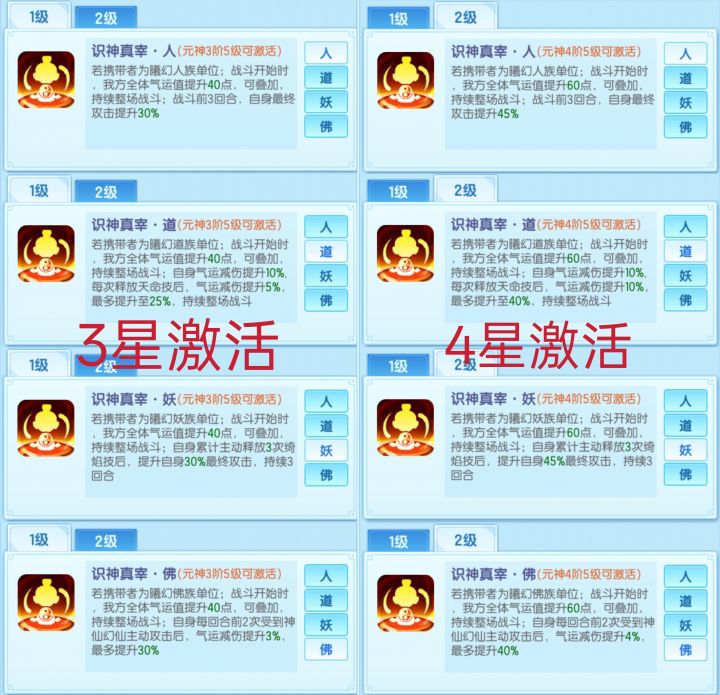 本次测试人员:笑语、IE 一、元神星级替换注:元神上阵>固元,不光元神,所有道具都是这样,高品质的、有星的优先上阵,没上阵位置了才去玩伴/助战/协阵/固元啥的。1.无新神炼技能/属性情况0星曦幻元神换3星琉璃元神1星曦幻元神换4~5星琉璃元神如果能把元神聚神拉满,给炮灰0换5都没问题,但就算可以换也不建议换,0换5会掉道行,pve会变弱,pvp的提升约等于没有。2.有4个新神炼技能