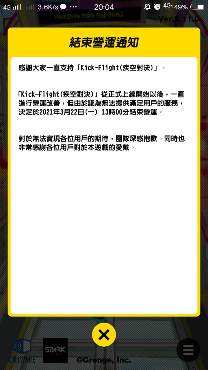 這裡是「Kick-Flight(疾空對決)」營運團隊。如「」的內容,2021年3月22日(一) 13時00分「Kick-Flight(疾空對決)」結束營運。公佈營運結束日程的同時,公佈以下能讓各位用戶享受到最後的活動及更新內容。◆在登入獎勵每天送能獲得圓盤30枚的券※最多能在10天獲得300枚圓盤※於1月23日(六)3:00開始適用◆膠囊開封時間調整為平常的1/10◆戰鬥勝利時的獲得
