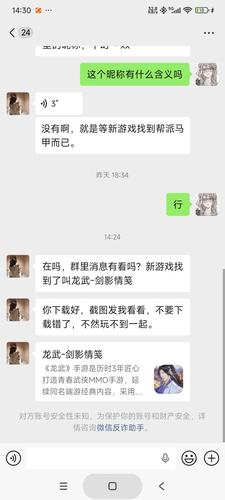 说个离谱的事,因为我玩的游戏比较多不是,逆水寒我上我小芽号搁虹桥挂机呢,有个人过来私聊我,问要不要带,然后加个微信群,我还以为逆水寒的群来着,结果进群没两天就说换这个游戏,微信发的链接,说大家一块去新游戏,人多热闹,按理这种集体换游戏的话不应该跑新服去,同理前两天我下了个诛仙晚上搁那做任务呢,有个人私聊我,拉我进团,一开始说是进他们诛仙的仙盟,说是加个微信群啥的方便联系,打本啥的也好拉人,还说自己老玩家,进群两天就说诛仙这游戏没意思,换游戏,无独有偶的是,这人换的也是龙武。😅还有你们这是官方吧,这上头不是写的官方入驻,他们说换这游戏的时候我就上Tap上来看了,还截图放他们面前了,他们说,tap这个是假的,宣传海报都一样啊睁着眼说瞎话说这俩海报不一样。