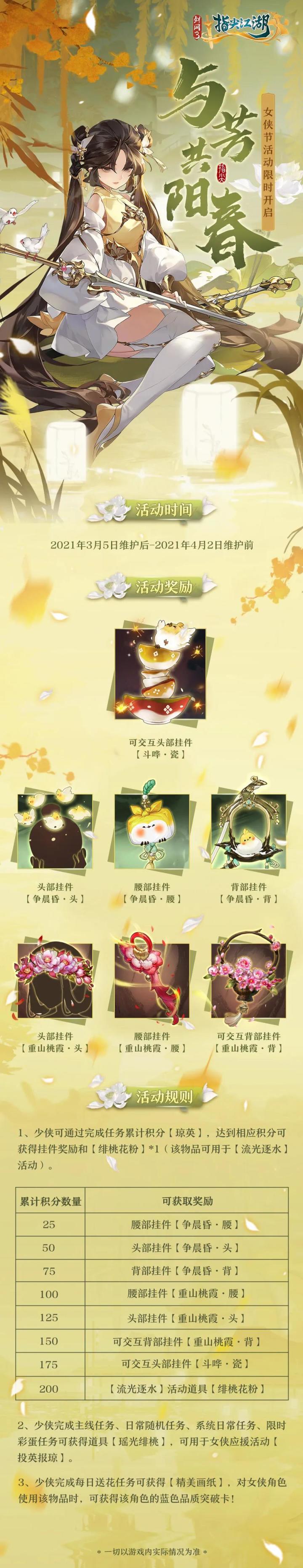 3妹为大家整理了女侠节的全部精彩内容~每日参与【与芳共春】以及系统日常活动,就能免费获得活动道具,还能解锁大量挂件噢!❤30秒教你玩转女侠节❤1、完成主线和日常,顺便寻找彩蛋任务2、用日常获得的道具为女侠赠英,并抽取道具奖励3、参与完成女侠节活动任务【与芳共春】获得积分4、使用积分解锁获得免费新挂件和抽奖道具*15、使用免费获得的抽奖道具一次抽中自己想要的奖品!祝少侠们想啥出啥!给喜