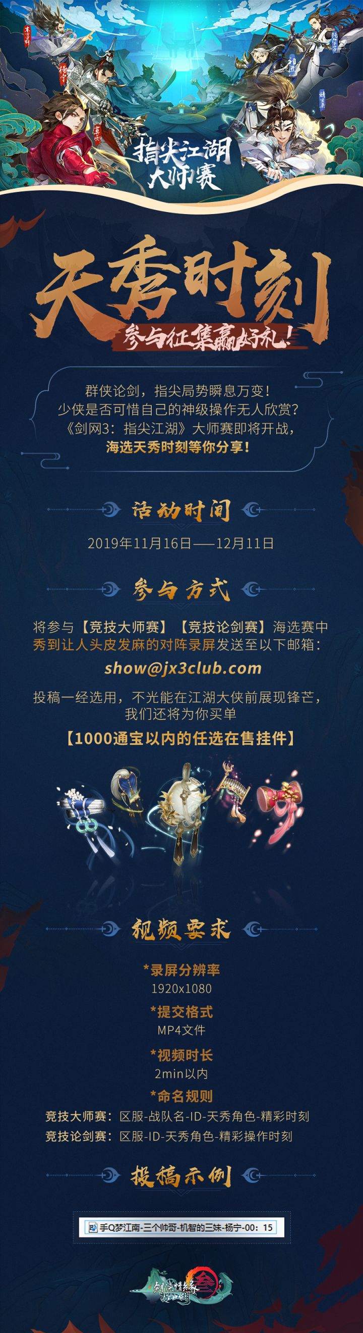 指藏千机!#剑网3指尖江湖# 大师赛天秀时刻征稿活动开启!在比赛过程中,小可爱们别忘了记录下惊艳四座的表现噢~小助手坐等录屏投喂!少侠的投稿一经采用,你最想要的在售挂件,由我们承包!你的天秀操作还将被更多小伙伴看到!投喂规则戳下图↓↓↓