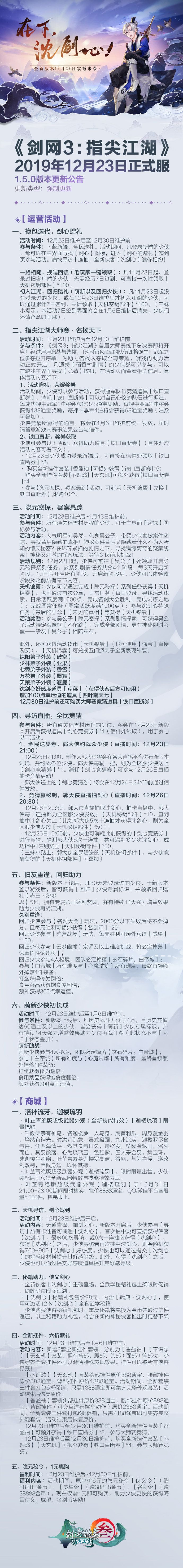 【剑网3指尖江湖1.5.0版本更新公告】2019.12.23