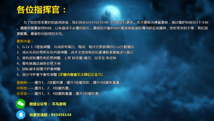 各位指挥官:为了给您带来更好的游戏体验,我们将在6月14日10:00-13:00进行更新。本次更新为停服更新,预计维护时间为3个小时。请提前留意游戏时间,以免造成不必要的损失。具体的开服时间可能会根据实际情况延后或提前,给您带来的不便,我们深表歉意。感谢您对游戏的支持。更新内容:1、G.Lv 1-7经验调整、完成所有每日、每周、每月任务获得的G.Lv点数增加2、成长礼包价格和礼包内容调整3