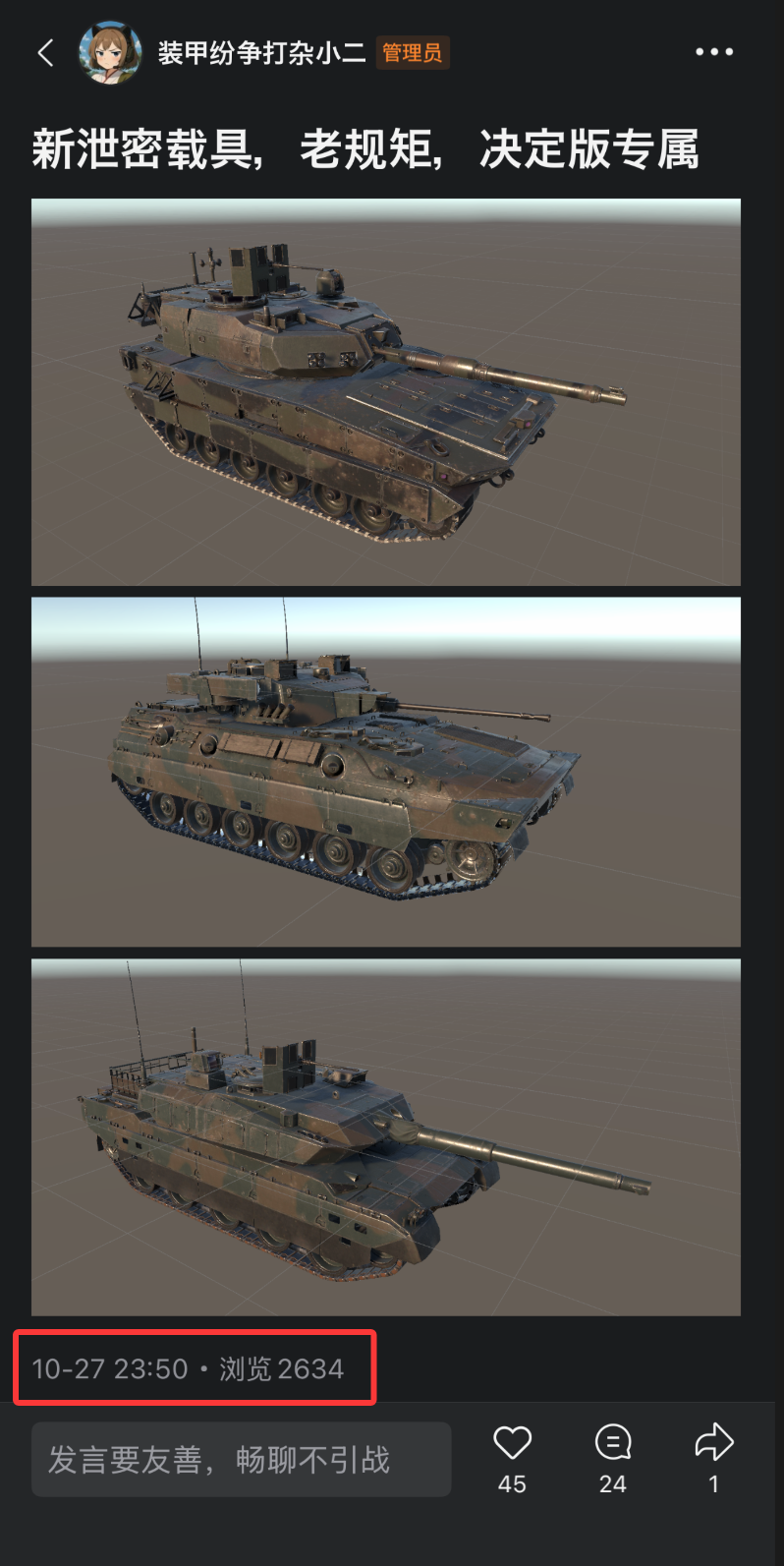 有些人指责我们抄袭《战争雷霆》的 M10 booker。我们需要指出的是,我们在 10 月 27 日就已经发布了相关新车的泄漏消息,远早于《战争雷霆》。此外,我们的模型并非来自《战争雷霆》或《装甲战争》。 请停止传播这样的谣言。