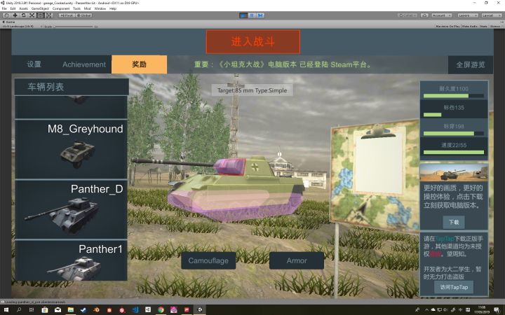 2019.2.8.7 - 2019.2.9.1 版本更新日志:增加弹孔效果增加击中坦克的物理效果爆炸效果区分穿甲弹与高爆弹增加车库装甲显示车库可以旋转车辆增加存档时候的提示所有载具模组需要更新!取消游戏内所有广告!最后,国内请在TapTap下载游戏更新 谢谢。全网只授权TapTap,其他渠道均为盗版。Steam版本也已经更新了!欢迎关注 ShanghaiWindy 公众号