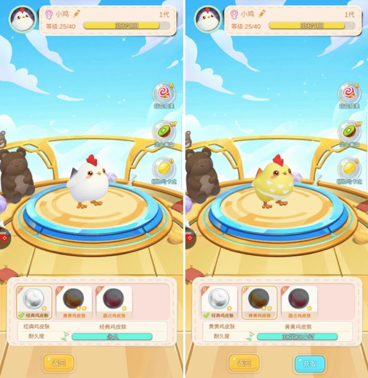 虽然领养的宠物都长得一样,但还是有办法让自己的宠物成为庞大宠物群中最亮眼的一只。在“查看”宠物界面的左上角,分别有“帽子”、“花纹”和“皮肤”三个按钮,里面各有不同的装饰可以提供给大家作为装饰宠物的材料。其中“帽子”可以在各大玩法中产出获取,不仅帽子款式繁多,而且每个不同类型的帽子都有不同的能力,可以说是好看又实用。“宠物皮肤”除了“开宝箱”和钻石购买之外,五代以上的宠物从出生开始就会有独特的