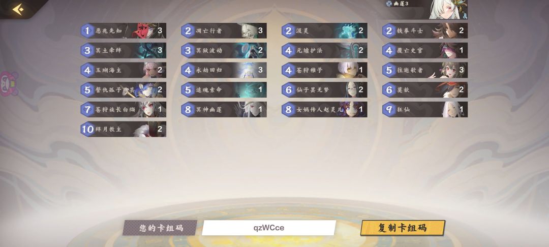 目前段位圣位一,游戏天数二,很喜欢这个游戏,不希望它凉了,所以贡献一下活跃度。 卡组如下: 造价为橙卡1张(名门公子-非必须没有也不影响),红卡0,其他都是白卡紫卡之类。完全不用氪金或者抽什么必须卡。我从天位上圣位胜率有七成,也可能跟我遇到的对手都是新手吧😄。大佬就当看个乐,我只是为萌新提供一个思路,不用非争什么。下面讲解卡组: 核心就三张牌,1费耀灵精兵,效果是协战涨身材,我们要养它,2费耀灵军
