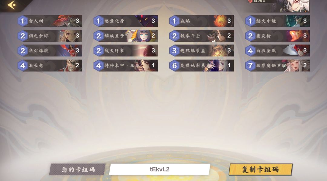 【寂灭天道攻略】逆鳞阳(可优化) 先申明,新人,玩游戏刚一个星期而已。发帖只为了参加活动,不是教学,不是教学(本菜比哪有资格教别人打牌) 卡组和战绩放下面了,赛季初水分大,觉得没说服力的可以直接叉掉页面,大可不必喷我,我知道我菜。 打法:跟传统逆鳞阳一样,以卖血苟命为主,教主逆鳞斩杀。 加入的新卡: 1.366:新一代抗快神器,个人觉得比银甲战神猛 2.513:十分契合逆鳞阳的思路,全场变1攻谁用谁知道,我只有两张,不然我就带满 3.977:打复活体系有一定用处,但是好像实战起来没有之前想的那么牛逼,毕竟木都不玩膀胱了开始走otk路线了。 4.645:感觉有点垃圾,也可能我用的不好,准备换掉。 对局感受: 打快攻还是看卡不卡手,卡手无 打otk木很难,偷一下防不胜防 打雷很难,没有带任何针对雷的卡,估计是打不过 打阴,小优吧,牌不是特别烂的话还好 就这样,启悟没抽到卡,所以没玩过,应该也能效果不错