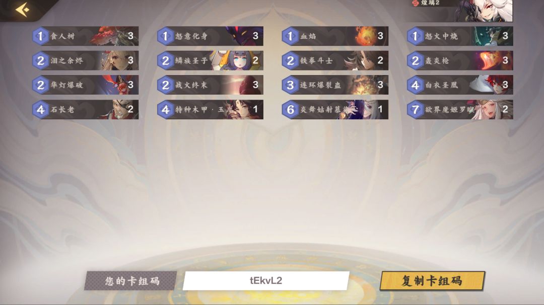 强度不高,这次是真的不高,不是九成胜率那种不高,胜率全靠对手配和 胜率和段位直接挂钩,段位越低强度越高 前期不要暴露卡组,不要让对手意识到事情的严重性 鉴于卡组难度比较高我分享一些对战记录以供学习 FFFFEW5DeC1H37eXcM244G4H5JcA7 FFFFER8D5C3H7P5G4P6S6YeLbF1Ab FFFFELcD6CeHbR8RdE3B1J7XdCcAd FFFFEF0D4C6