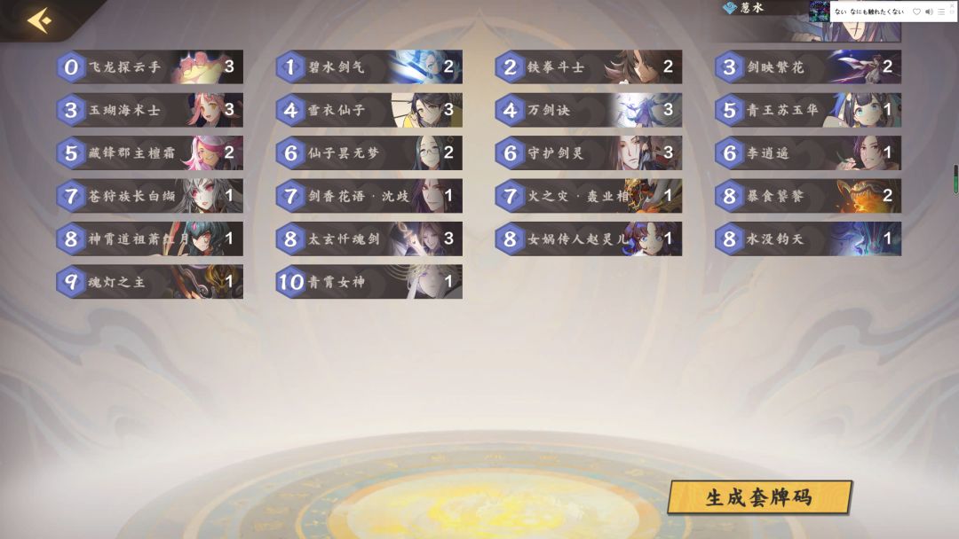 这次是控场水。或者说,罚站水。 核心思路是,把对面场面补满,攻击减到0。开始罚站。 卡组原型借鉴自主播,芷若。他在b站直播。 现在我调整来,适合我的节奏。就是我的原创卡组就。 罚站水思路一直都有,只是卡组一直不成熟,只能做娱乐卡组。 我这套可不是娱乐哦,我敢说,只要主将职业不能解自己场的,必拿下(比如土)。快速铺场的,拿下。防不住。 能解自己场的,或者木的圣月当空,如果一心防,就很难拿下了,此时我