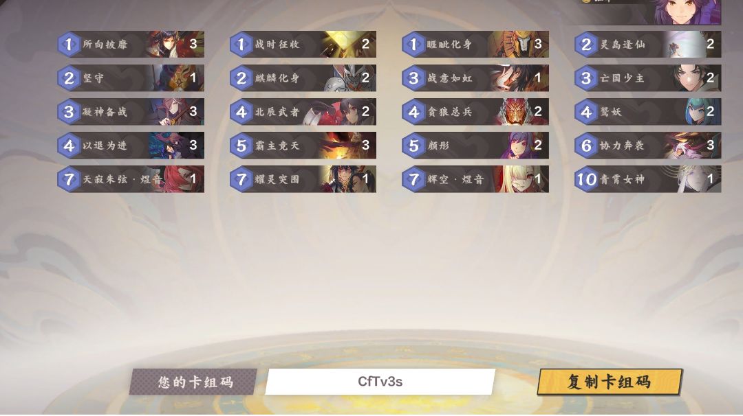 直播时玩了很多把孤军金,强度还可以,卡组代码:CfTv3s,根据局势来留牌,比较怕回手或消灭,切记女神可以消灭魔族,有兴趣的兄弟们可以来b战来观看,晚上8点左右直播,id也是骑着曾某去上学