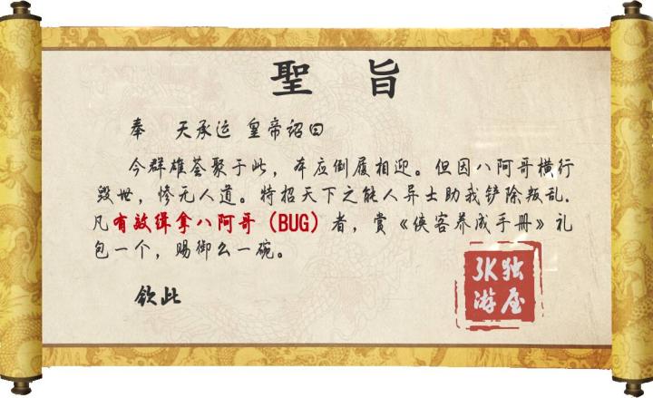 各路英雄豪杰今日广聚此地,想必都是为了《侠客养成手册》而来。可惜秘籍面世不久,根基尚浅,时常受到八阿哥(bug)的困扰。为此,特颁发此道圣旨,招募天下之侠客,缉拿八阿哥。凡有效缉拿反馈者,可获得礼包数个。钦此。好了好了,说人话。在两个月的闭关修炼后,我们决定开启再一次的测试。这次服务器的容量较之上次扩大了好几倍。希望不会再有炸服。但是,这是一个有着几百条支线,超自由剧情发展,超随机探