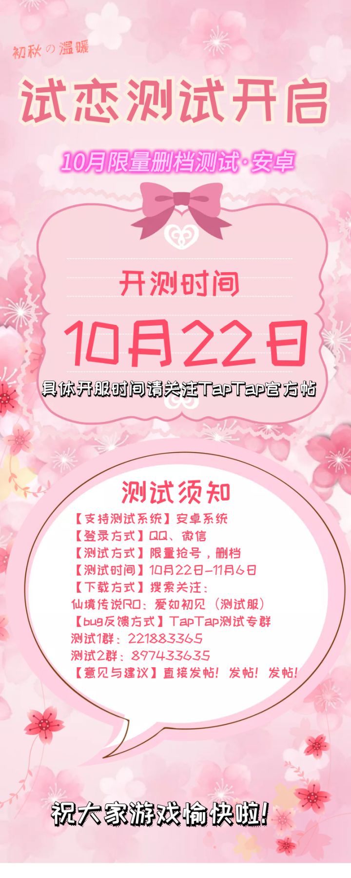 米娜桑~经过10月技术测试的玩家反馈收集,我们对游戏版本进行了集中优化和系统调整,更多调整内容前几日已经被酒馆馆长sama剧透很多啦,还没有看到的小伙伴请点击前往详细观看今天,小仙为大家带来了10月试恋测试的重要消息:10月22日,试恋测试正式开启啦!大家一定有超级多问题不断冒出来,让我们进入一个快问快答时间:Q:具体的测试时间什么时候开启?A:由于需要配合平台的原因,具体的开服时间
