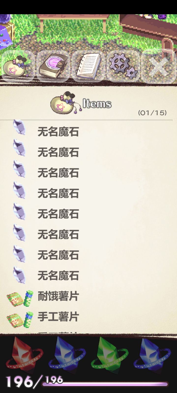 无名魔石后期缺少的话,可以在散步的魔女记忆里刷。除了一开始需要几个魔法攻击/防御,我这边一次最起码可以刷18个左右的无名魔石。(*´I`*)我是简中版的。散步魔女的记忆差不多只需要四个魔法就可以通关:【空棱镜】(物理屏障+反击)【神圣十字架】(十字型攻击范围,但是不能贯穿)【抗地图】(耗能5mp的地图生成)【新月红莲盲目斩】(由于记忆迷宫的特性,(没有墙)所以即使相隔比较远,但仍然可以