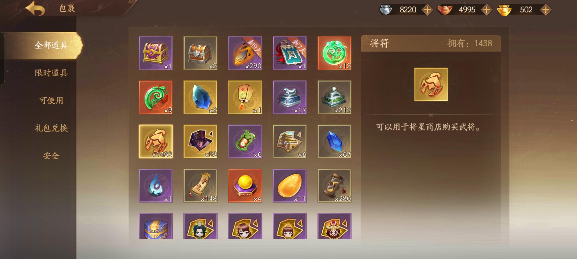 米妹,庞宏,谋骆驼,文钦,鲍三娘,铁匠,刘永,马均,程式+12.9宝玉,还有5k左右绑元,接近1500将符 将军 官服