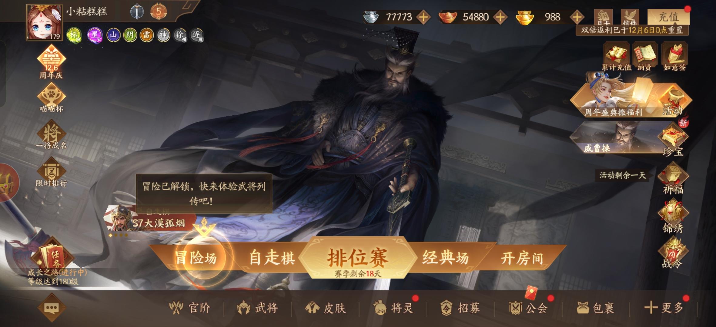 注意注意全体目光再次向我看齐我宣布12月6日0:00周年庆正!式!开!启!全新武将!皮肤!活动!福利!统统都在等着你!现在开始倒计时!今晚12点,全体上号!是兄弟,就线上见!冲鸭! 【年度盛典武将·威曹操】12月6日年度盛典上线汉末挟天威以平乱世的雄主体力:4 势力:魏【掇月】出牌阶段开始时,你可进行至多三次拼点,你可令赢的角色摸当前拼点次数张牌。若你赢,你可改为对一名