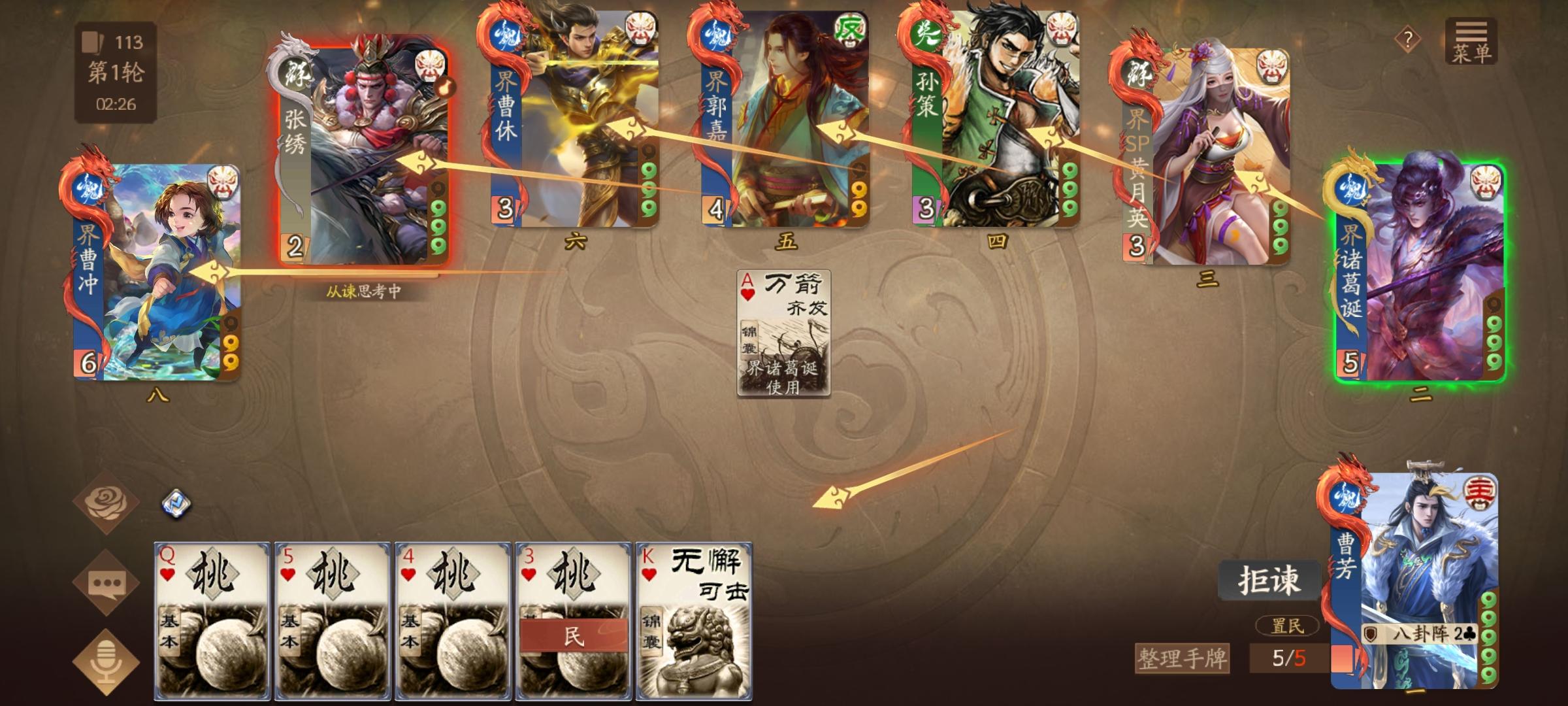 牌堆里藏了一个薛灵芸😂回合内民用出去摸了一把桃子