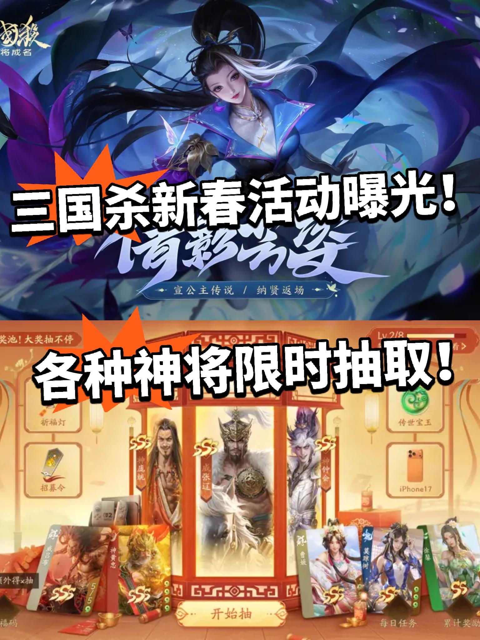大的来了家人们!近日 三国杀新春活动正式官宣了。2.1-2.7宣公主传说皮肤上线,福利还一波波加码,这事一出立马引发玩家热议!本周起游戏开启狂欢模式,周末两天限时畅玩,2v2排位和斗地主模式狂送超级福利,自走棋还能享限时装备、限时主公双开,福利直接拉满。 还有限时战令任务能做,2月5日起完成任务就能领专属抽奖券,抽得越多奖励越豪华,新春宝玉武将神钟会、神庞统、神黄忠,还有贺岁纳贤武将谋刘协