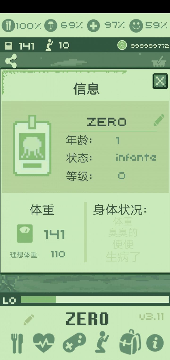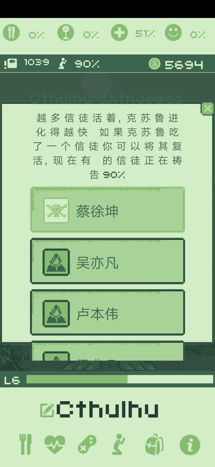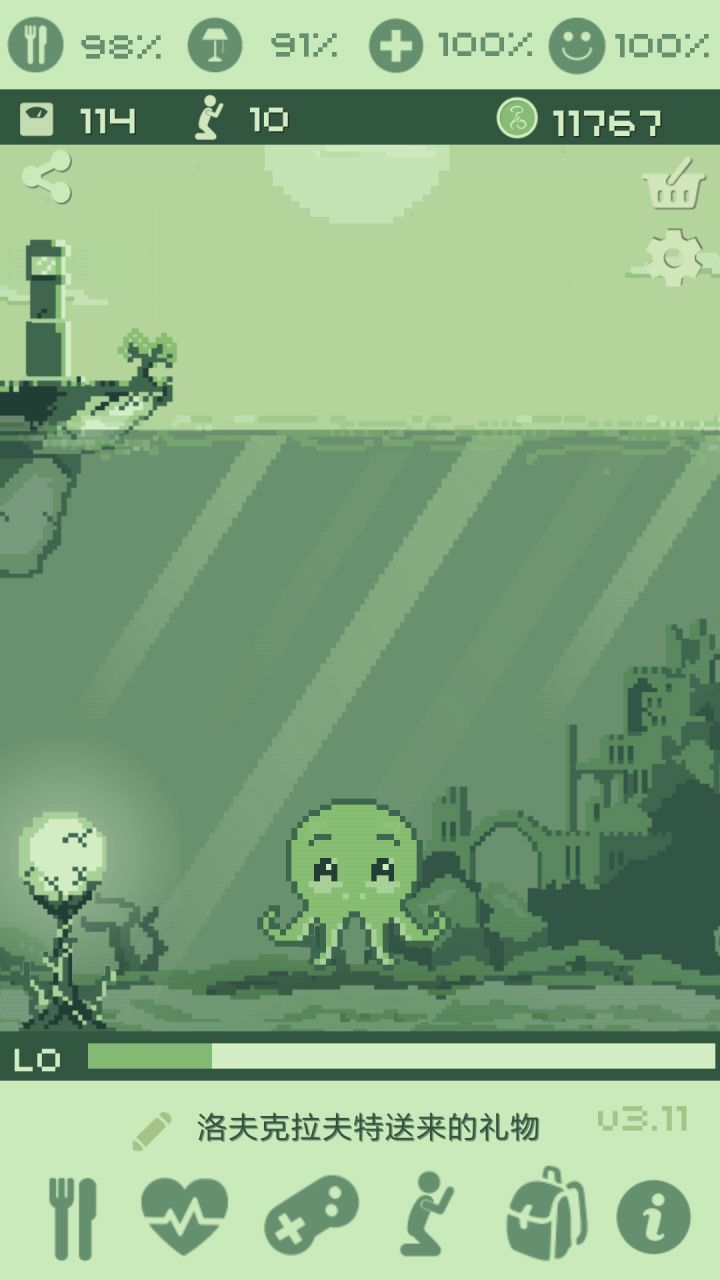这是电子宠物游戏最上面是克苏鲁的各项数值:1.餐刀餐叉那个就是饱腹度点下面同样的按钮就是喂食可以喂动物或者活人克总每天口味不一样,注意心形2.一个牌子上面两个z,那是疲劳度克总左边那个水晶球一样的东西就是台灯点一下关了克总就会睡觉休息3.健康度,受多方面影响吃太多不运动不行,点下面那个心电图高楼大厦符号就是去摧毁城市两个脚那是给别人带来噩梦,以此类推4.开心度,综合各方面数值影响你采取的任