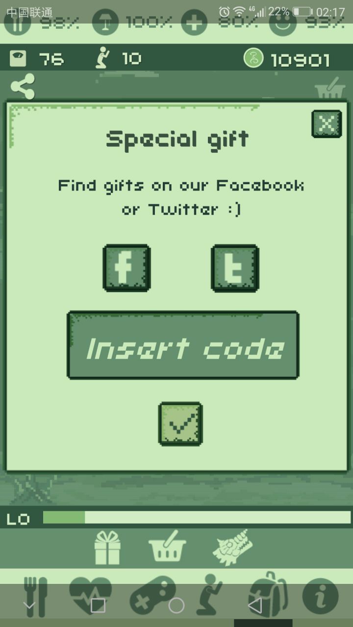刚刚入坑,发现这游戏还可以填礼品码,顺着facebook找到一个,欢迎补充~礼品码:001000 给10000克币呢还是蛮多的点击下排书包图标,里面的第一个礼物盒子,填进insert code