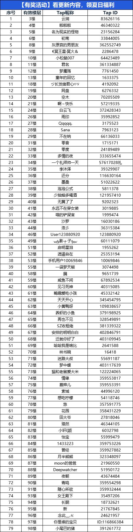 勇士大人们好~给勇士们带来个好消息就是我们的iOS更新啦! 回到正题又到了我们的开奖时间啦~我们的“看更新内容,领夏日福利令”活动将揭晓获奖名单了哦~ 导游喵对每一条参与信息都进行了仔细的查看收集,勇士们真是太认真啦!并抽取了获奖玩家,让我们一起来看看吧~ 【开奖公示】 导游喵根据活动规则,统计按要求参与的有效楼层后,汇总情况如下: 使用随机数抽奖方式结果如下: 为了保护勇士们的账号与个人隐私