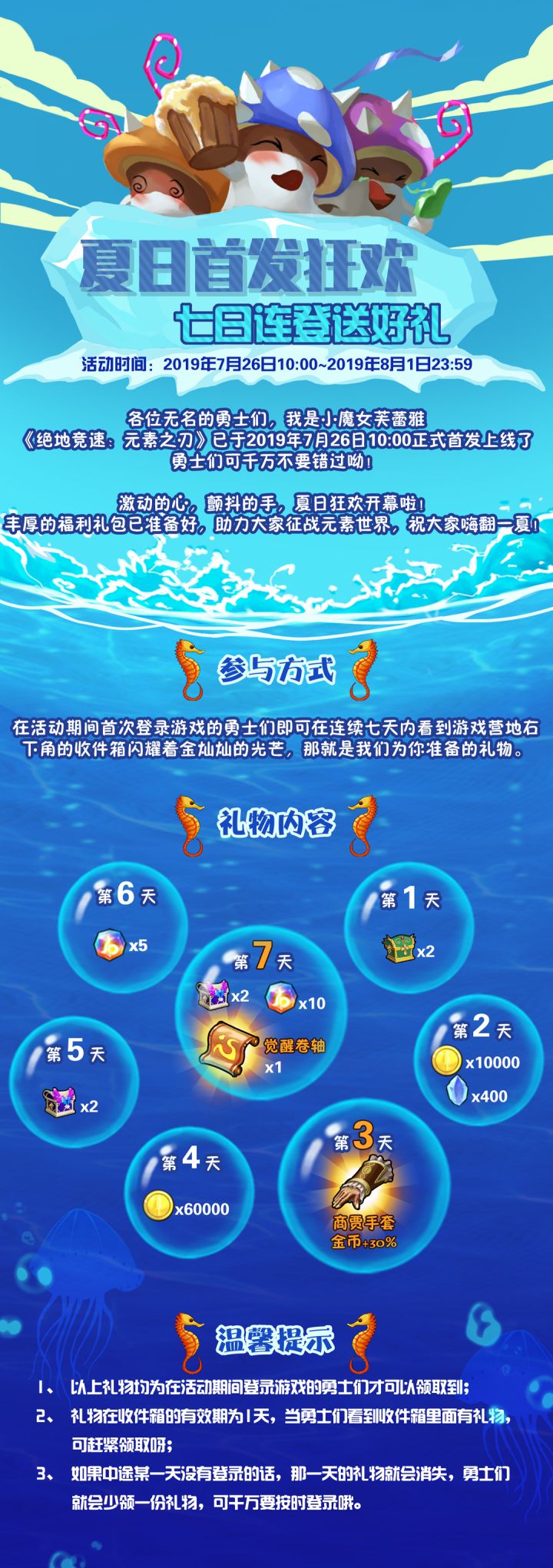 由于比较多玩家跟我们反馈“7天登录奖励”不合理以及存在比较多的疑问,为此我们作出以下调整:凡是在此活动时间内,首次登录的玩家在接下来的连续7天内登录都能领取完7天的奖励。活动时间:2019年7月26日10:00-2019年8月1日23:597天登录奖励活动:在活动期间,首次登录游戏的勇士们即可在连续七天内看到游戏的营地石右下角的收件箱闪耀着金灿灿的光芒,那就是我们为你们准备的礼物。