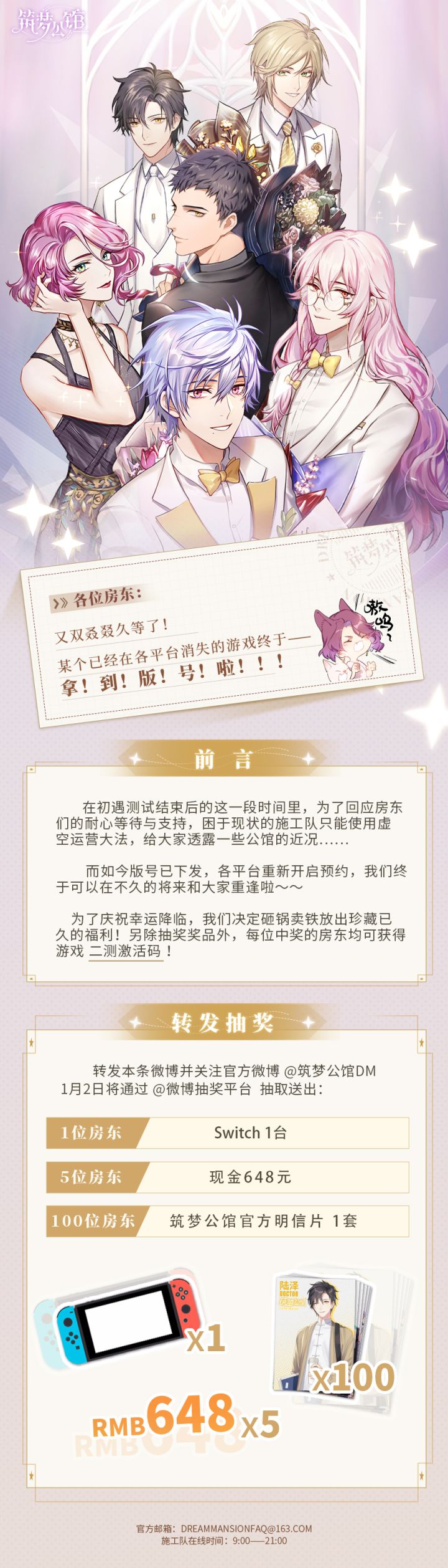 各位房东大人!又双叒叕久等了!某个已经在各平台消失的游戏终于——拿!到!版!号!啦!!!在初遇测试结束后的这一段时间里,为了回应房东们的耐心等待与支持,困于现状的施工队只能使用虚空运营大法,给大家透露一些公馆的近况……而如今版号已下发,各平台重新开启预约,我们终于可以在不久的将来和大家重逢啦~~为了庆祝幸运降临,我们决定砸锅卖铁在微博平台放出珍藏已久的福利!★转发 @筑梦公馆DM 置顶