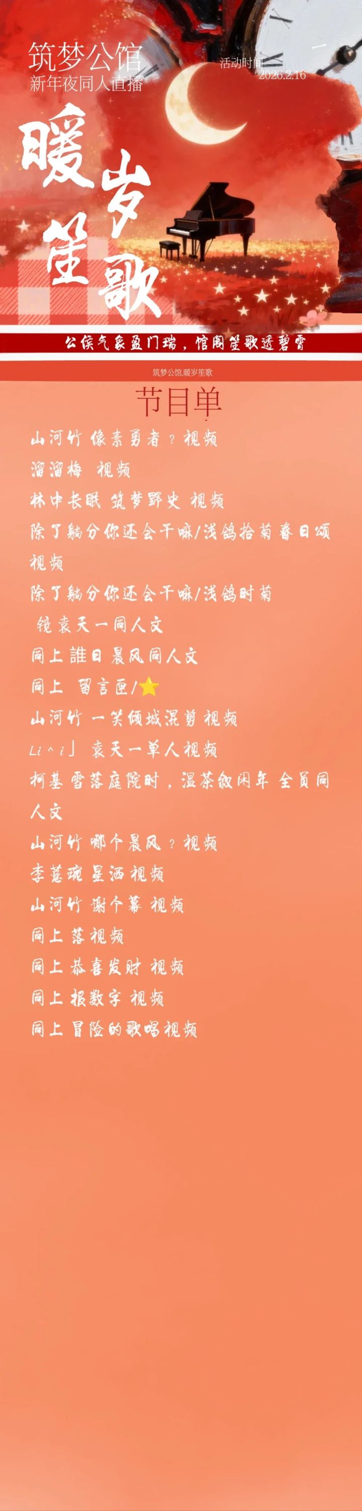 特大好消息!!!筑梦公馆新春会在今晚开播啦,欢迎各位房东于19.30光临,哔哩哔哩<每一次不期而遇>直播间!!!不节目单不完全可能还会加,时长较短!祝各位房东除夕快乐!!!