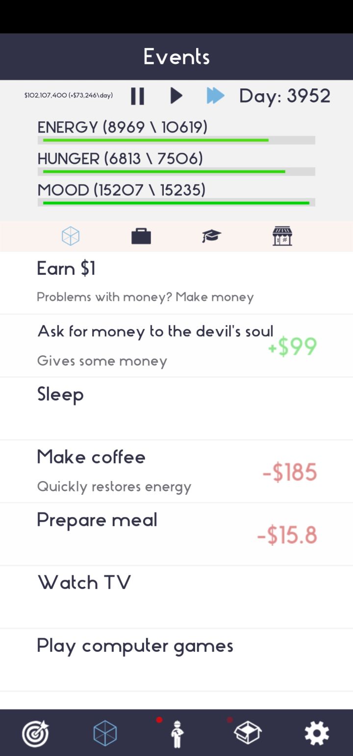 新人流程:赚钱-学习-就职-升职-买游艇-升职-再买游艇-买工厂自行车没用,找到工作后就可以卖了,去升职业等级,等职业满级再去做100个的任务和工厂恶魔没用,等钱多再买起步时点钱一只手点钱另外一只手点饥饿精力什么的,点多了有combo能拿额外的钱3个职业 程序员/画家/政客前期触发对应职业读书,读完可以就职政客后期触发剧情才可以就职,但可以提前学习程序员一般会先出现,可以先任职,读完