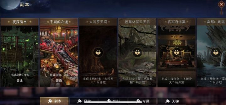 《盛唐幻夜》副本中分为PVE和PVP两项,其中PVE活动分为剧情副本,日常副本,组队副本,专属副本与天梯。今天小编具体跟大家介绍一下几章剧情副本。 剧情副本是围绕《盛唐幻夜》主线剧情开展的玩法,玩家可以通过通关主线而开启对应的副本,给予玩家更加逼真融入游戏氛围中的体验。【夜探鬼市】进入副本之后,玩家先后击败地痞、流氓、打手,最后击败鬼面人和铁面人即可解救丫鬟,通关副本,成功通关副本可以获得银